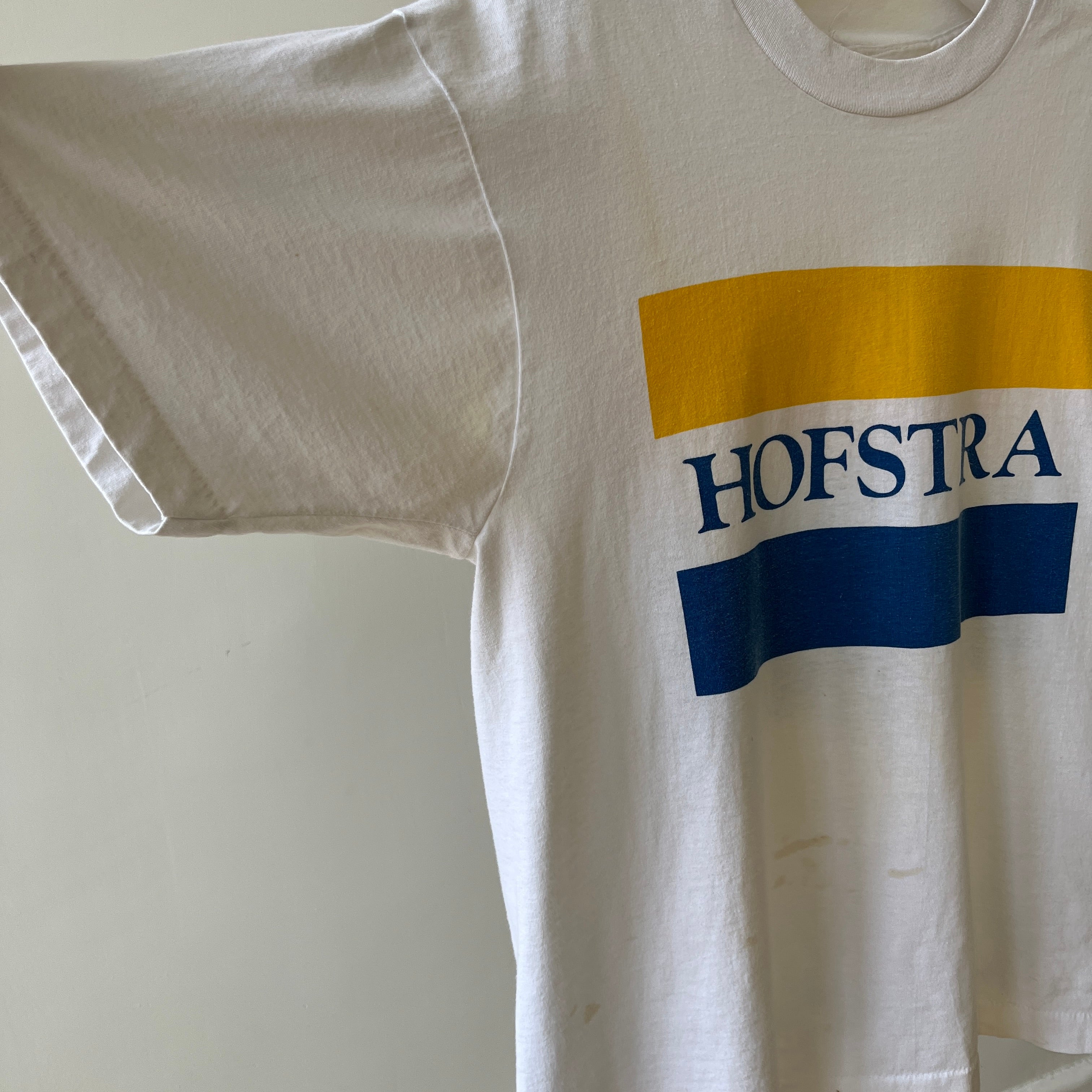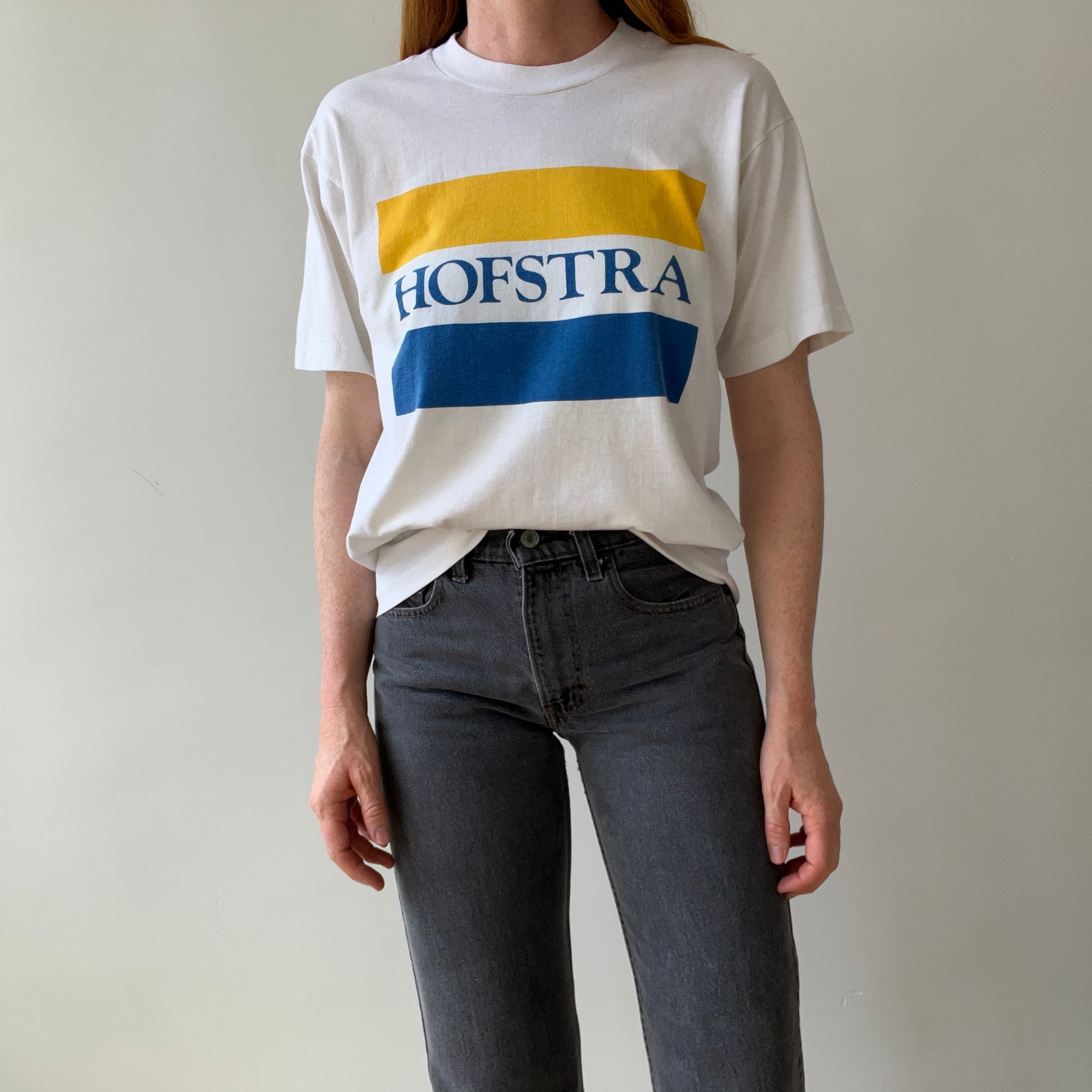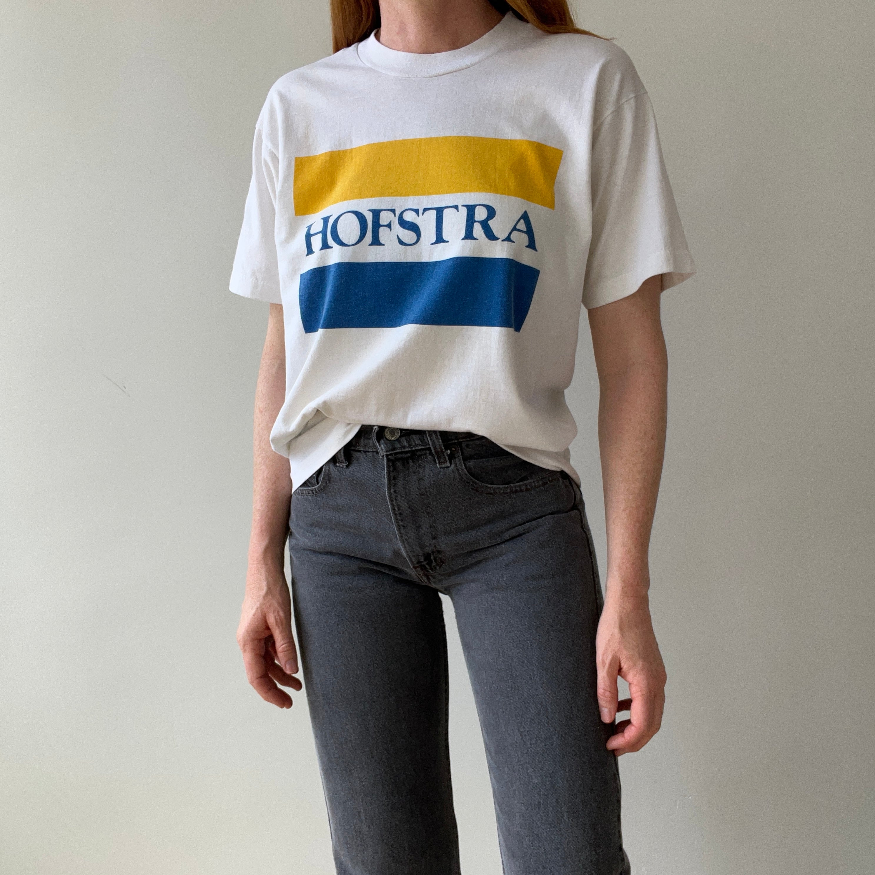 Notes: stains, soft cotton, loose fit, boxy, single stitch, made in usa, university in hampstead, new york with a 70.6% acceptance rate - on a collegiate pacific tag!