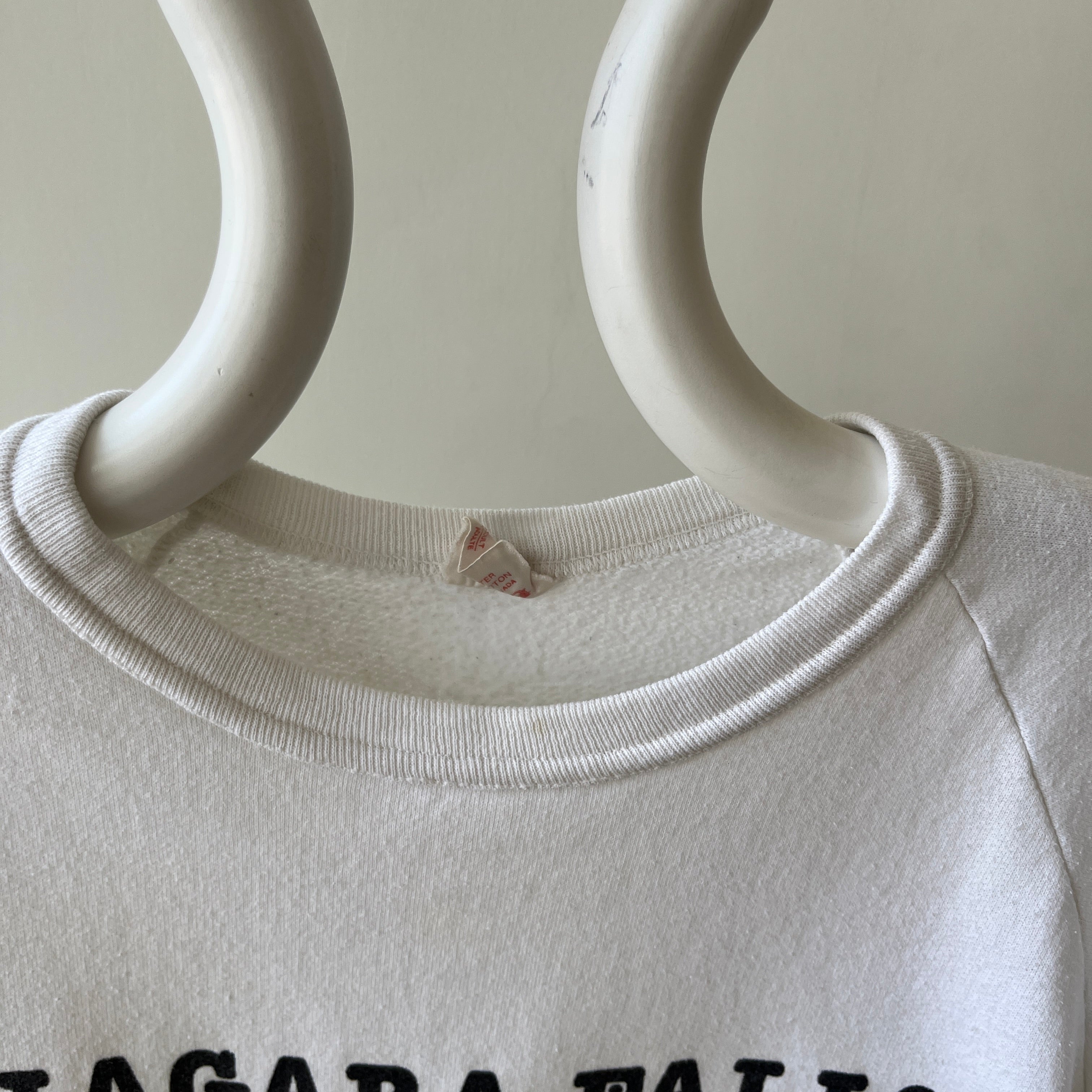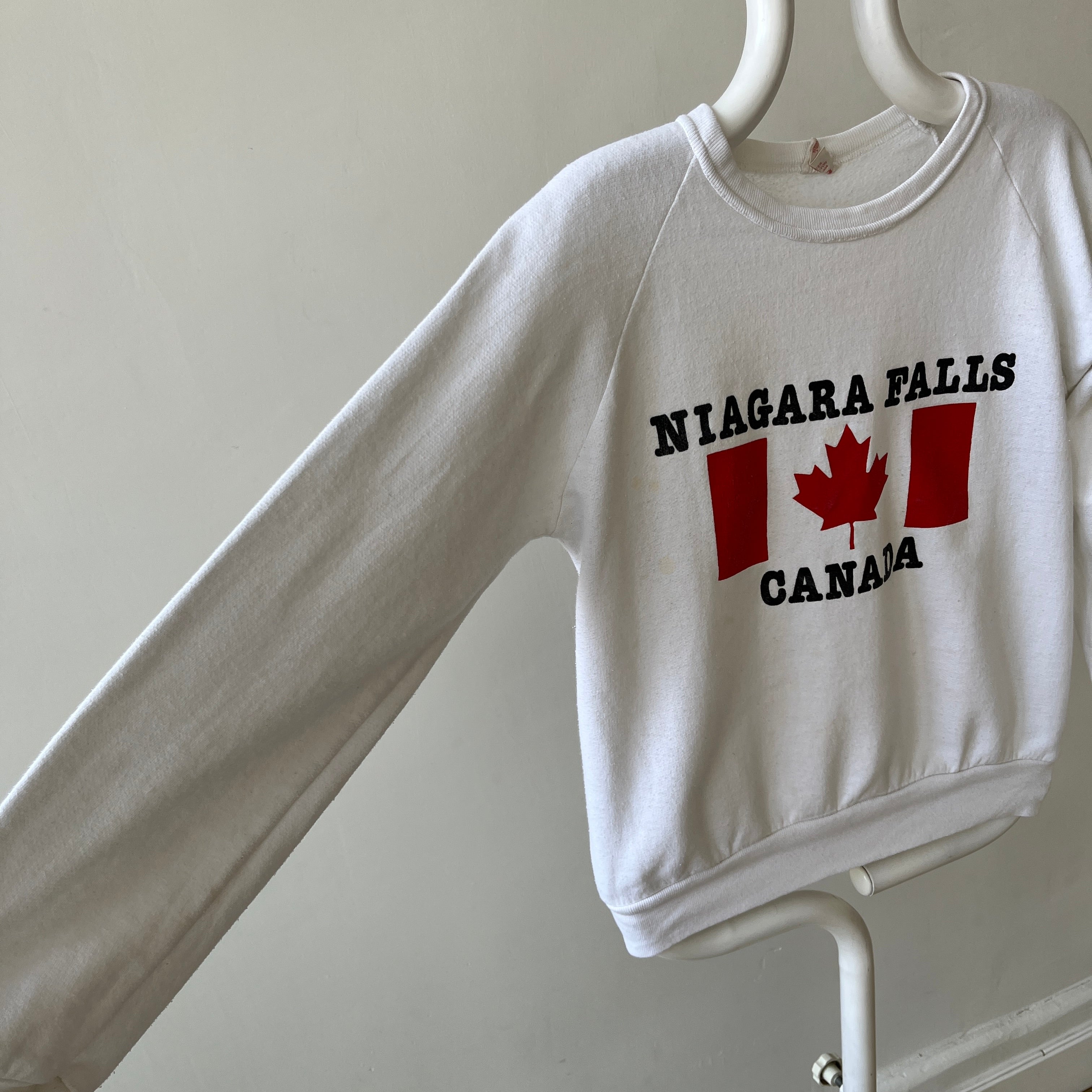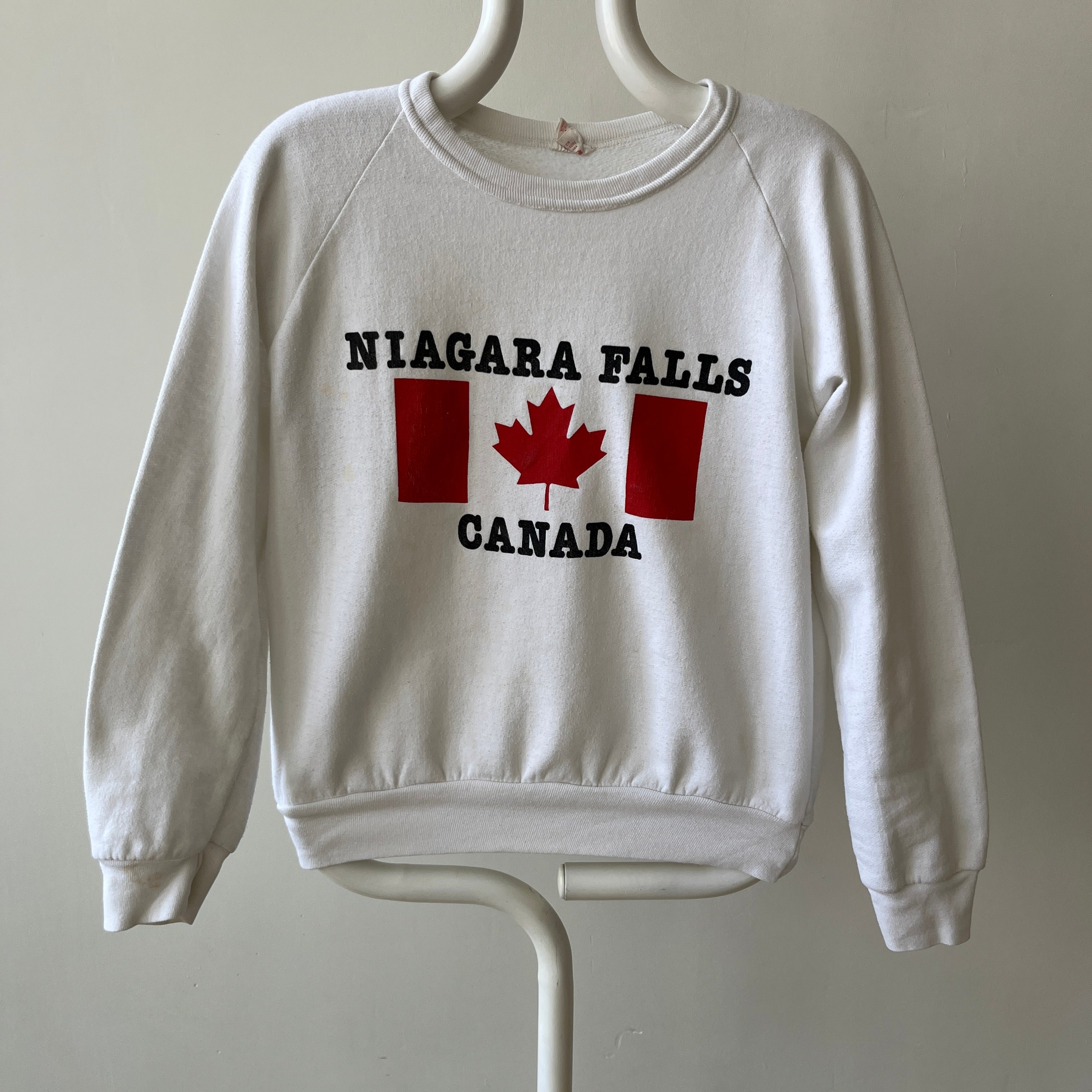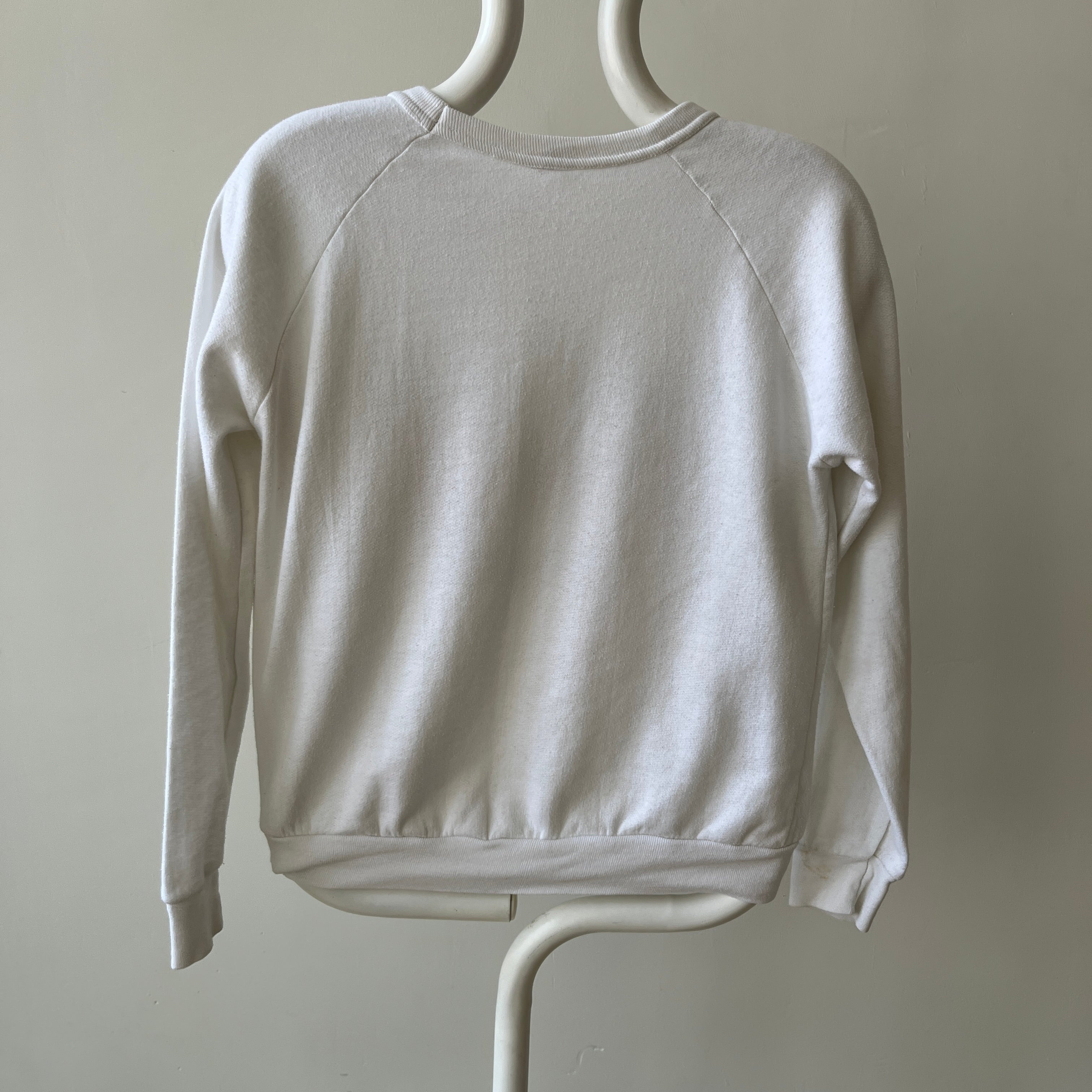 Notes: faint stains all over, ribbed neck collar, raglan fit, made in usa...the irony ;)
