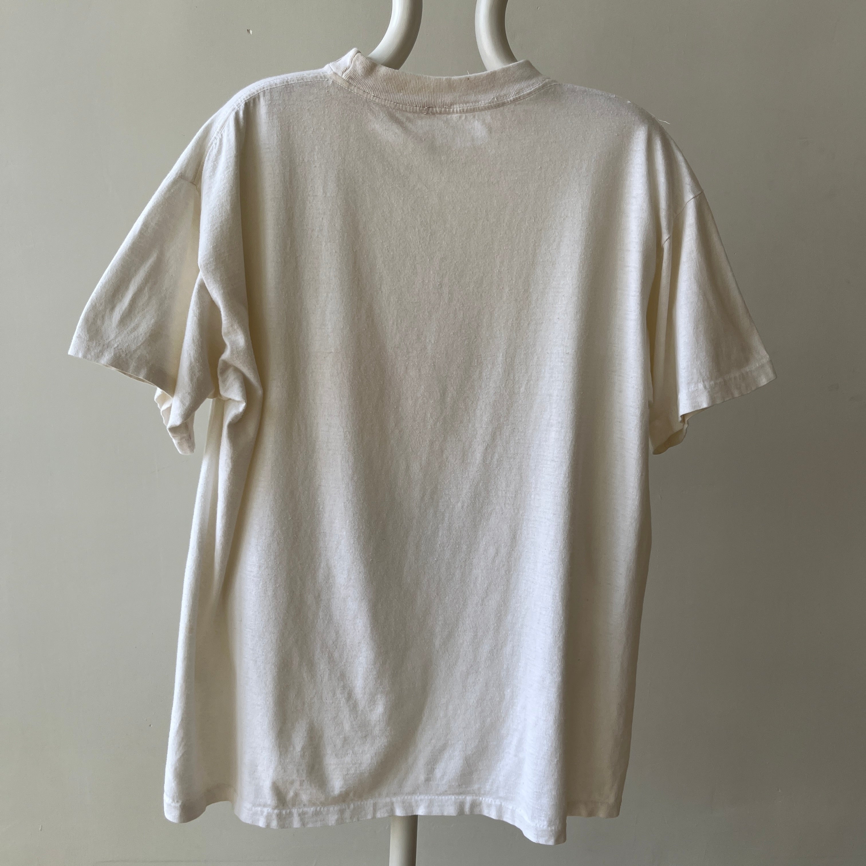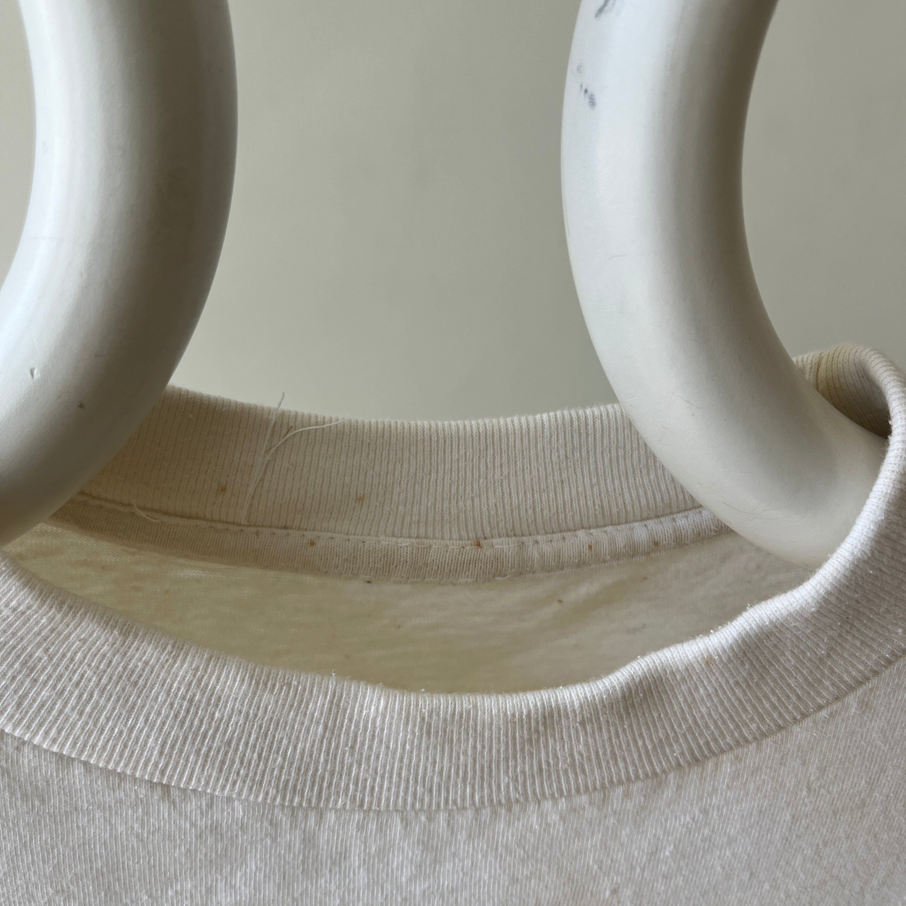 Stains are cool. But if I don’t have you convinced, that yellow jalopy hanging out on your new-old (now off) white tee could have been a mustard mishap from catching a fly ball at the World Series in ’83 with a hotdog in hand. Or from changing a flat tire on a college road trip to meet your future ex in-laws? Stains have stories even when they’re in the pits! Sweating in your favorite Hanes crewneck on your first middle school date can have a life long impact on a t-shirt.