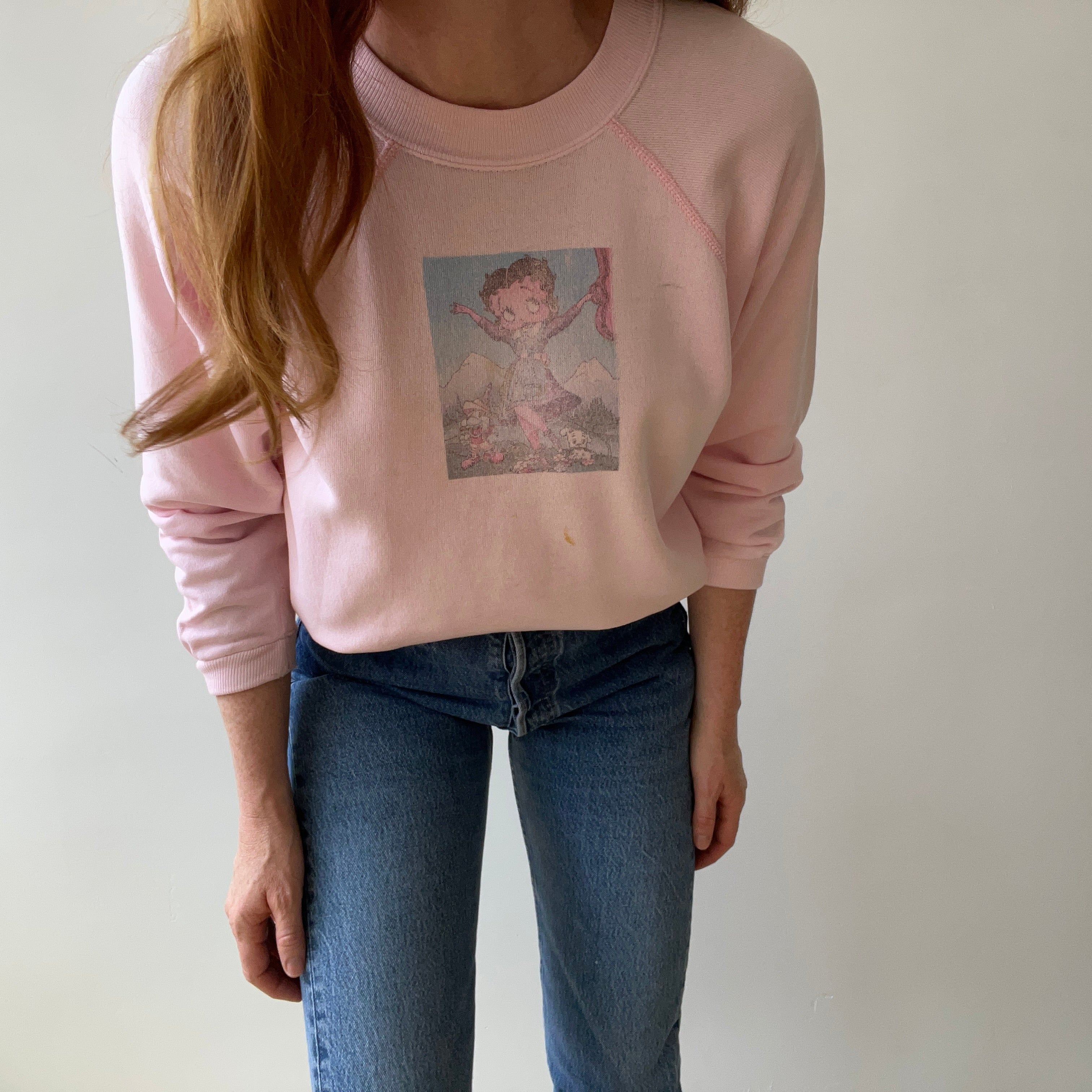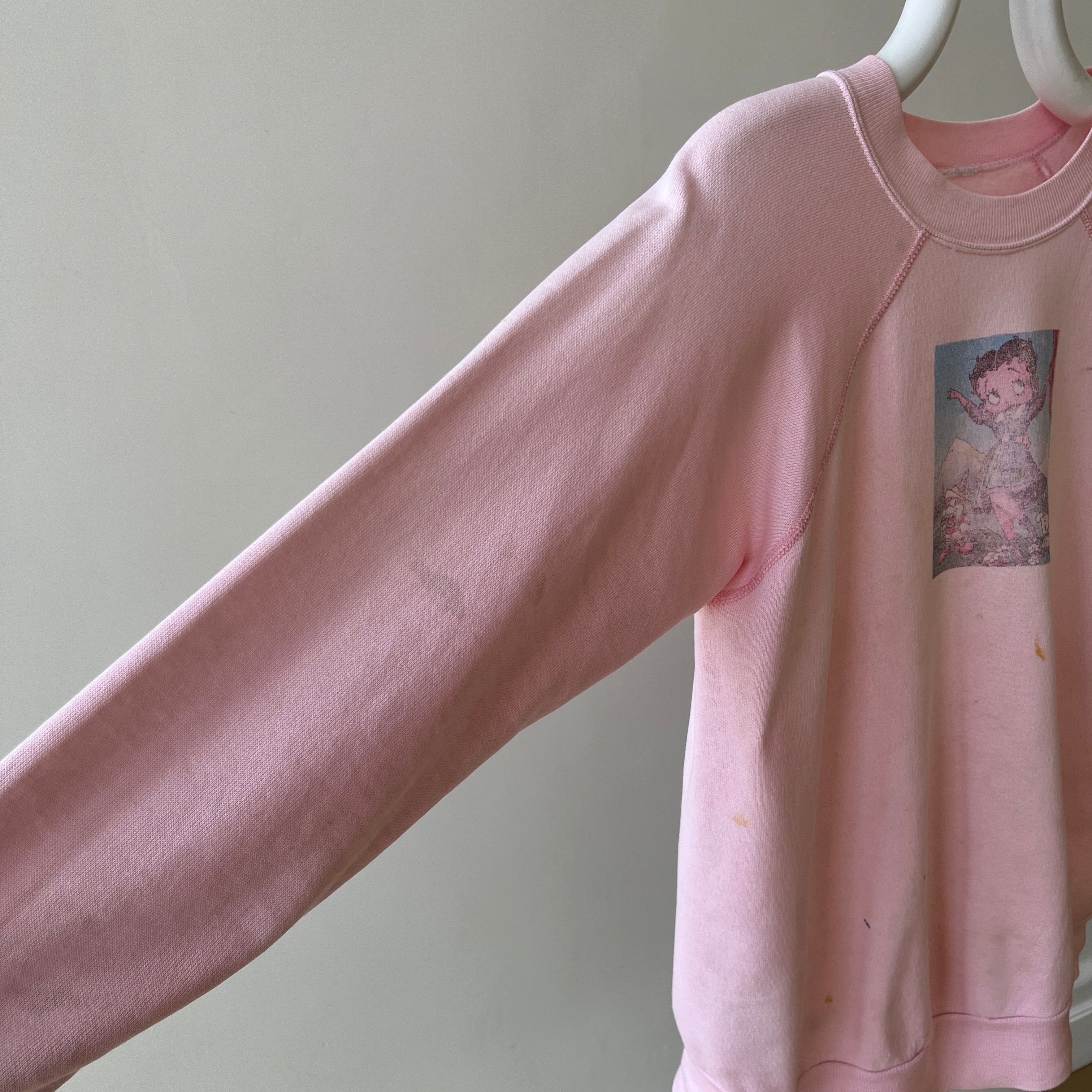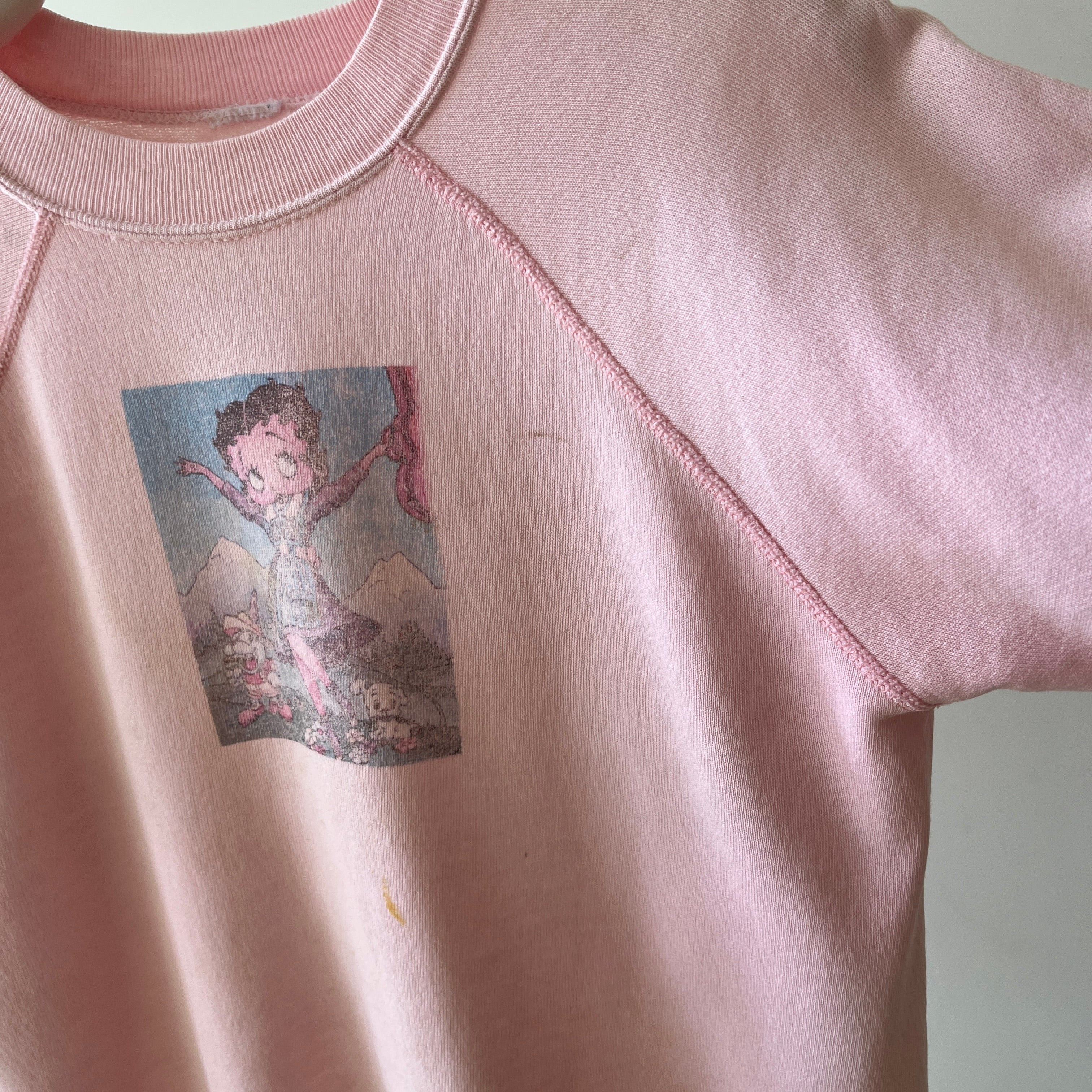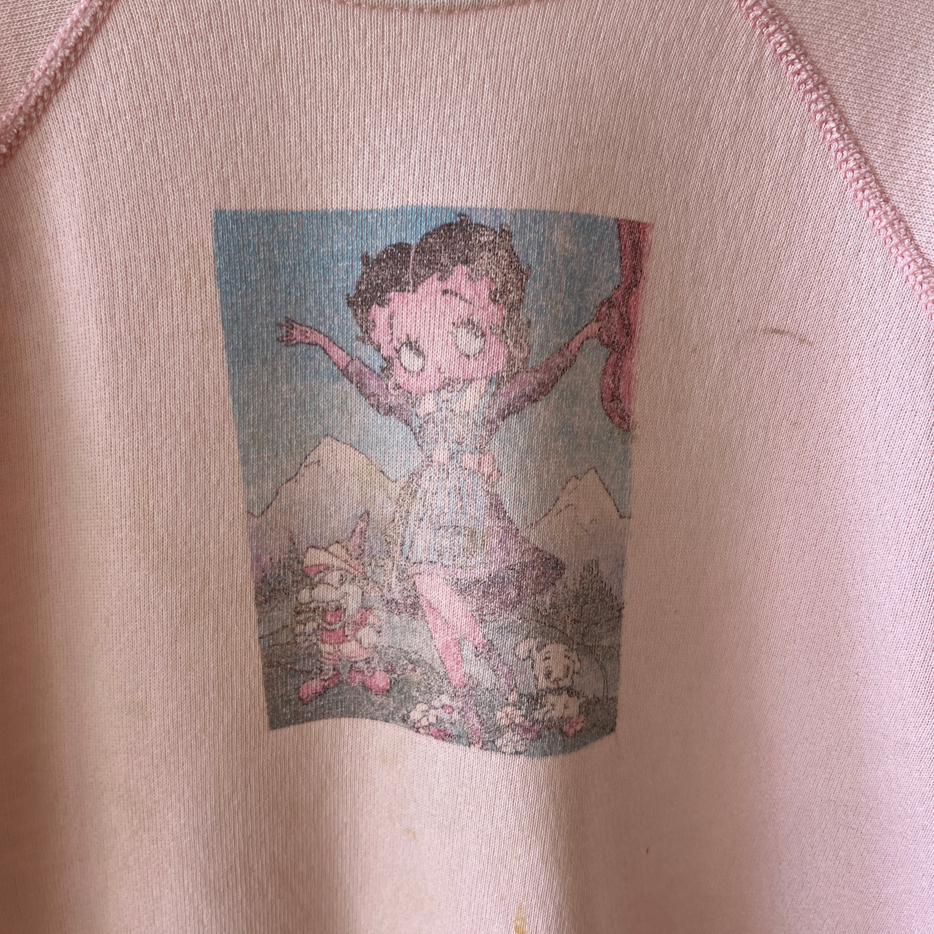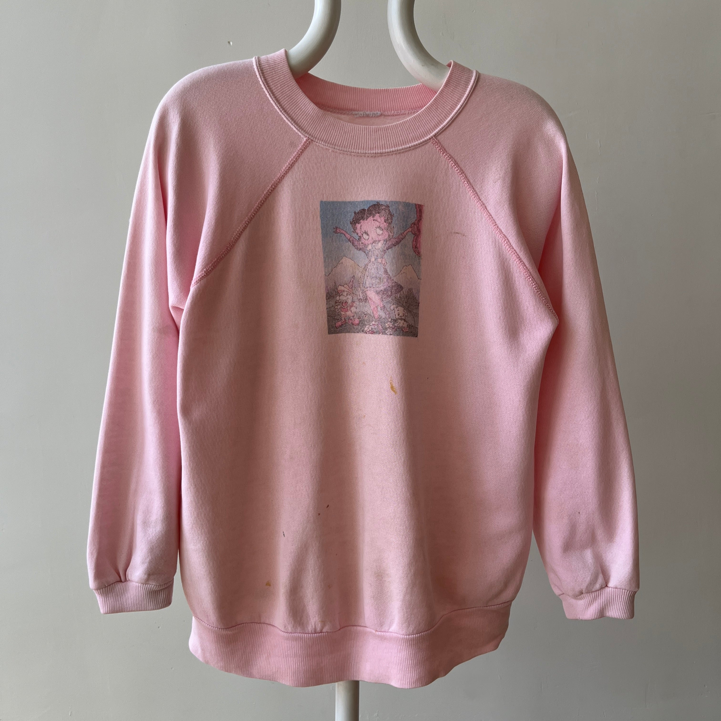 Notes: stains, cuffs have been altered, small holes, raglan cut - for boop fans. this was a diy image i think? nicely worn. she's collectible.