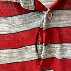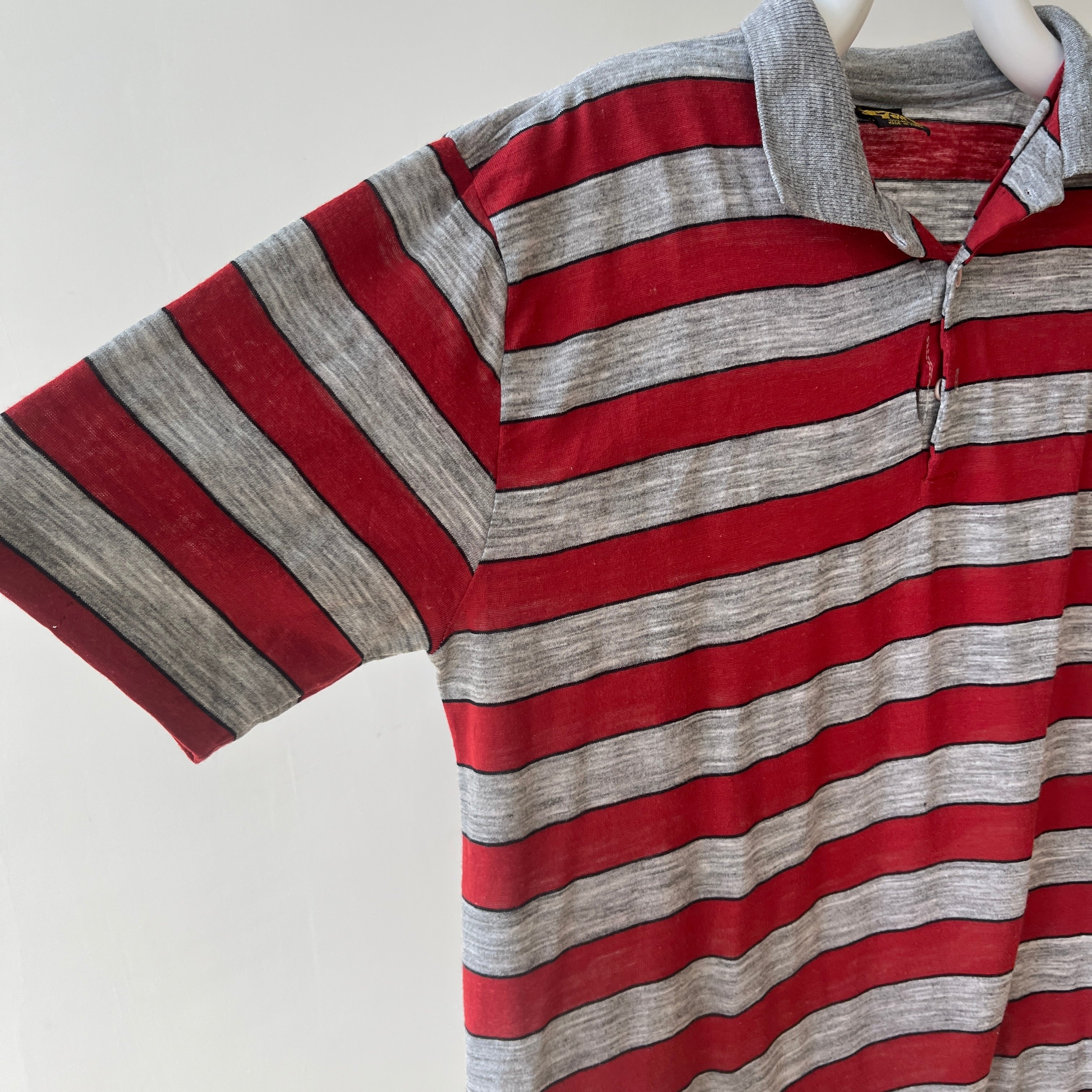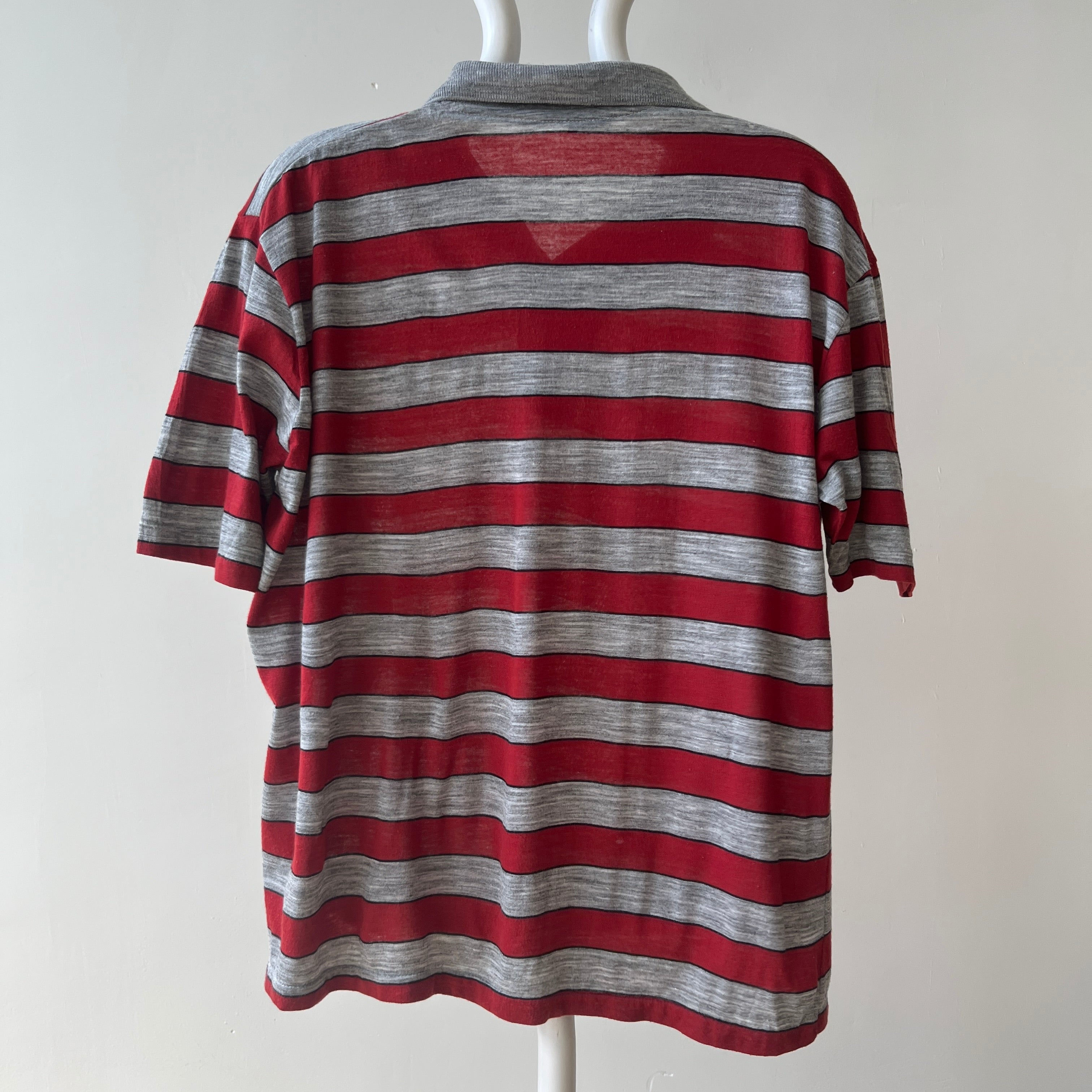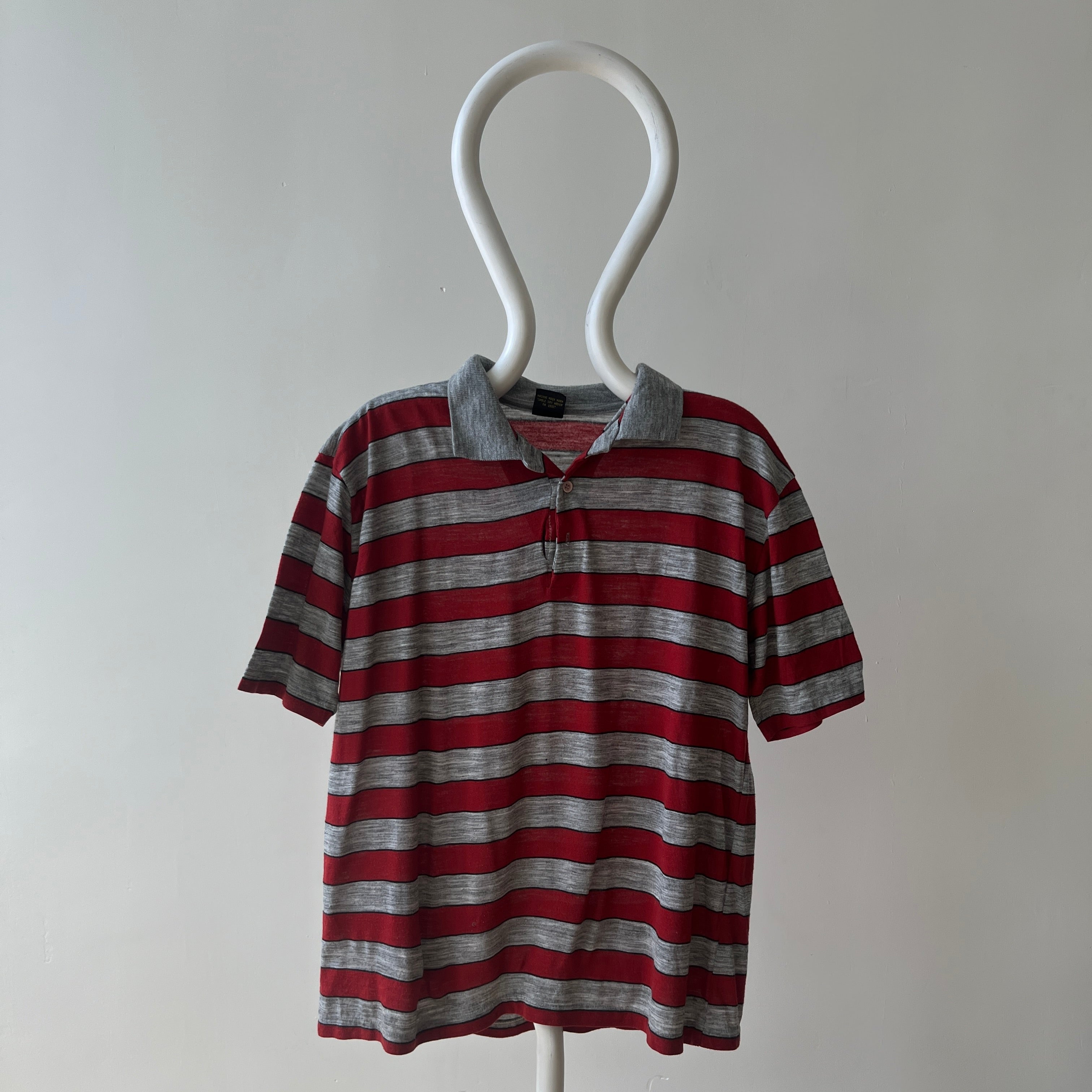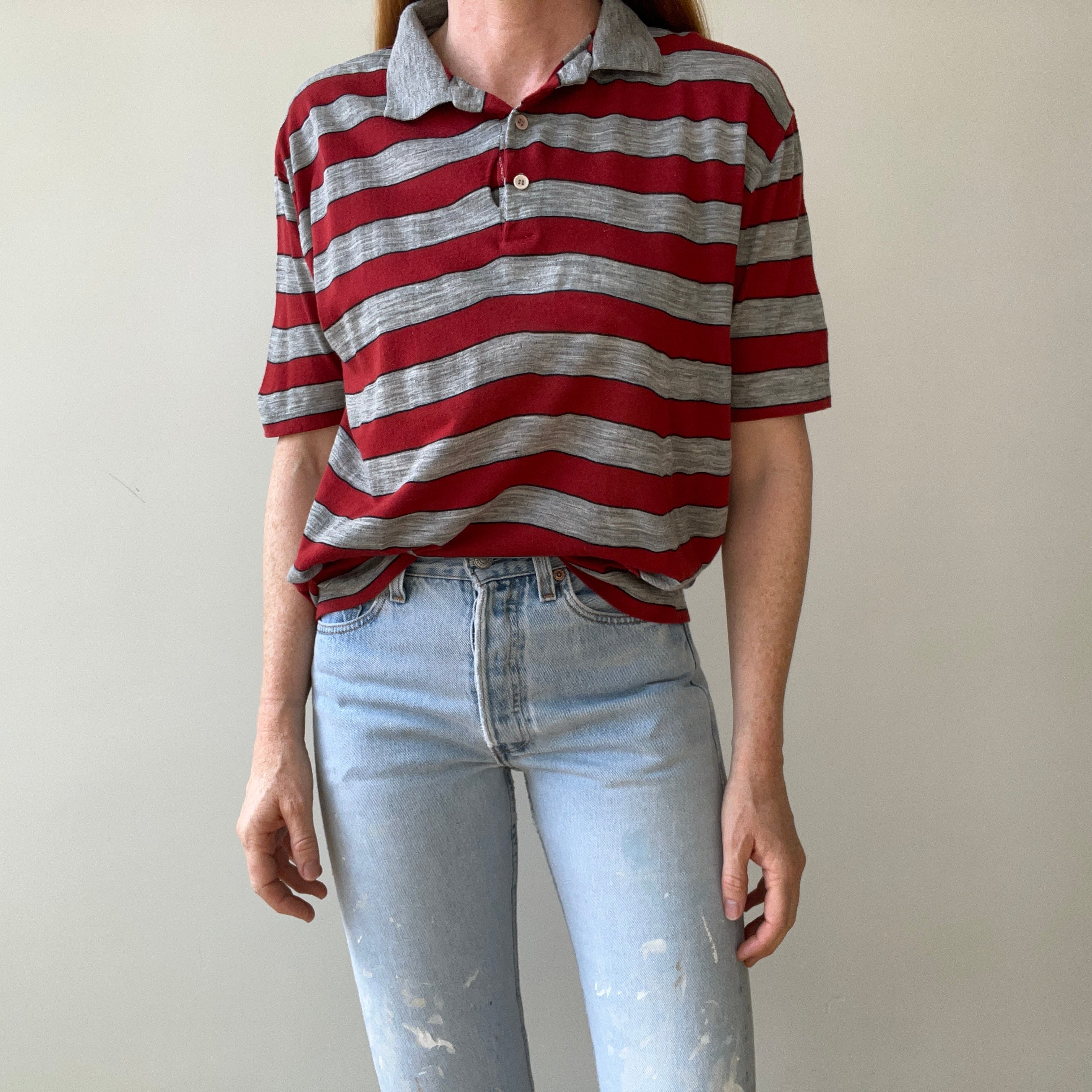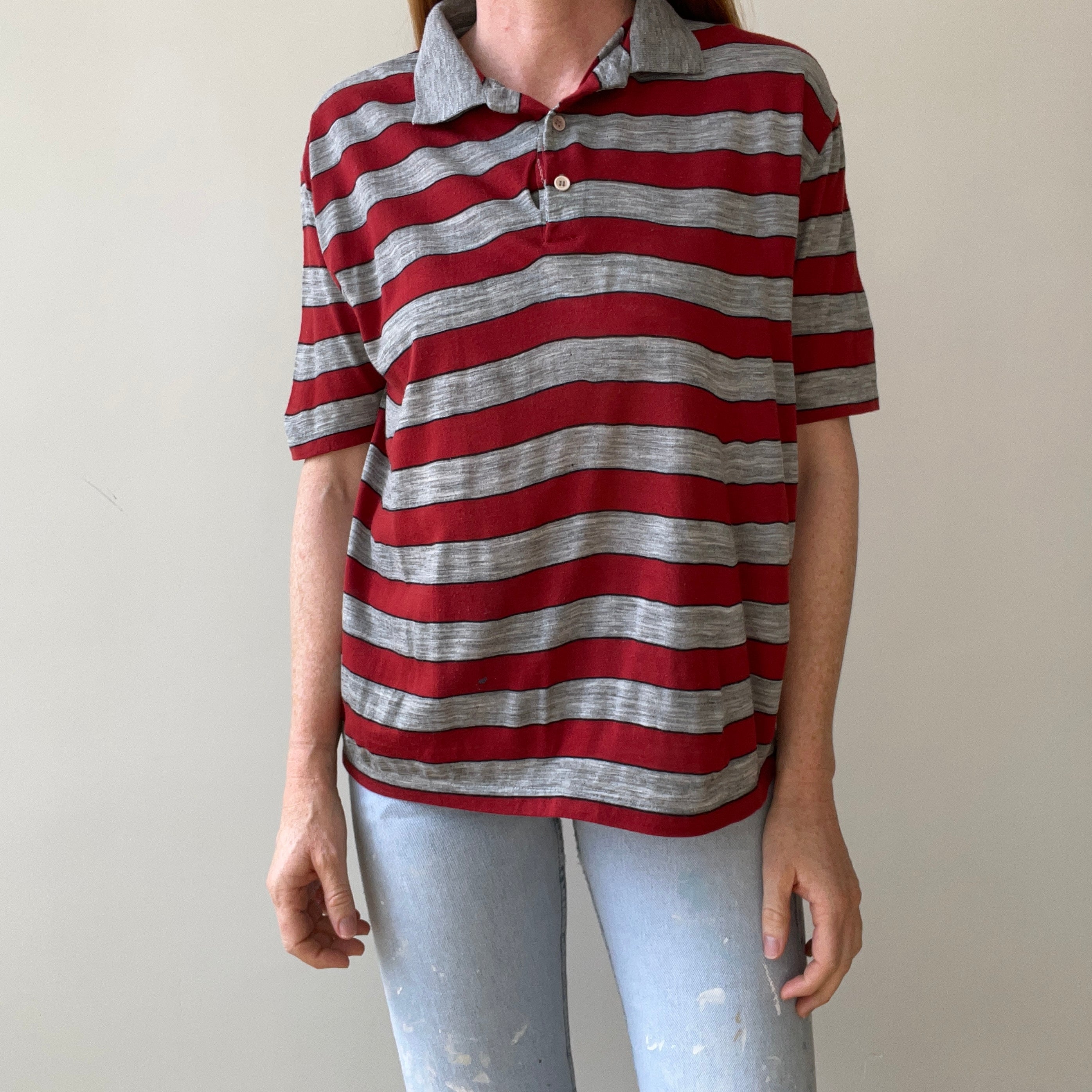 Notes: rip near button closure, small holes, thin material, boxy fit, single stitch