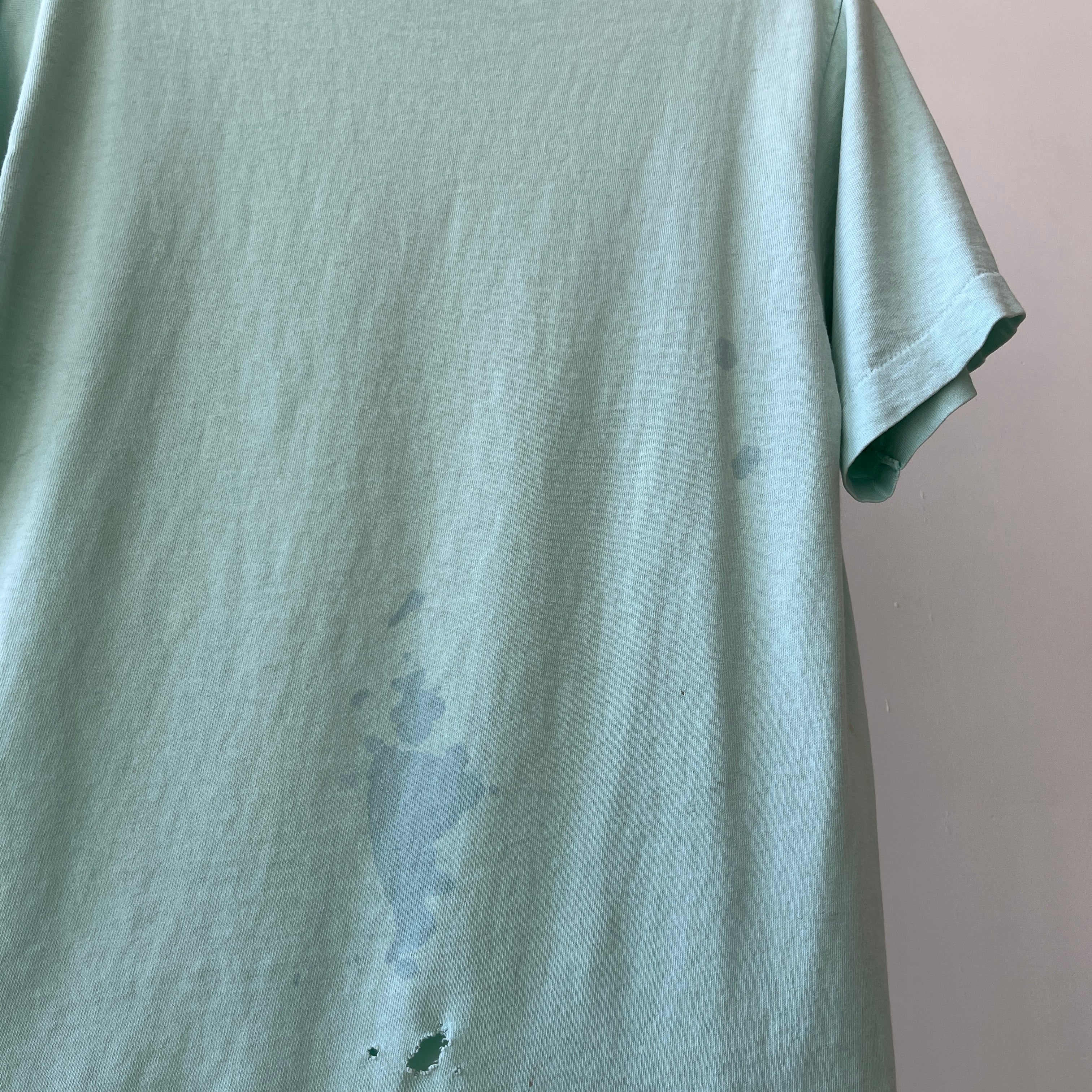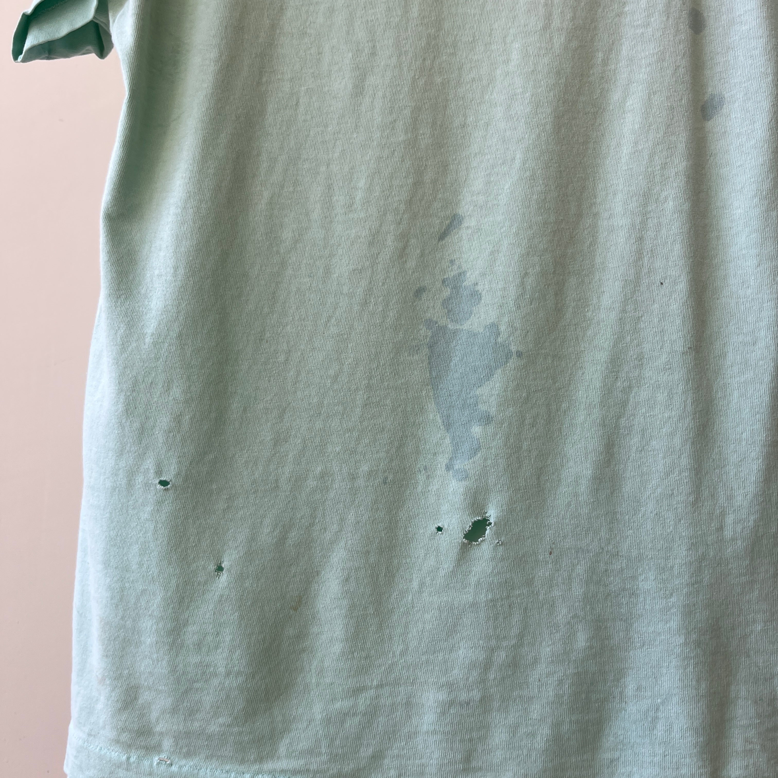 Notes: beautifully thrashed, fades, stains and holes all over, single stitch, fruit of the loom tag, made in usa