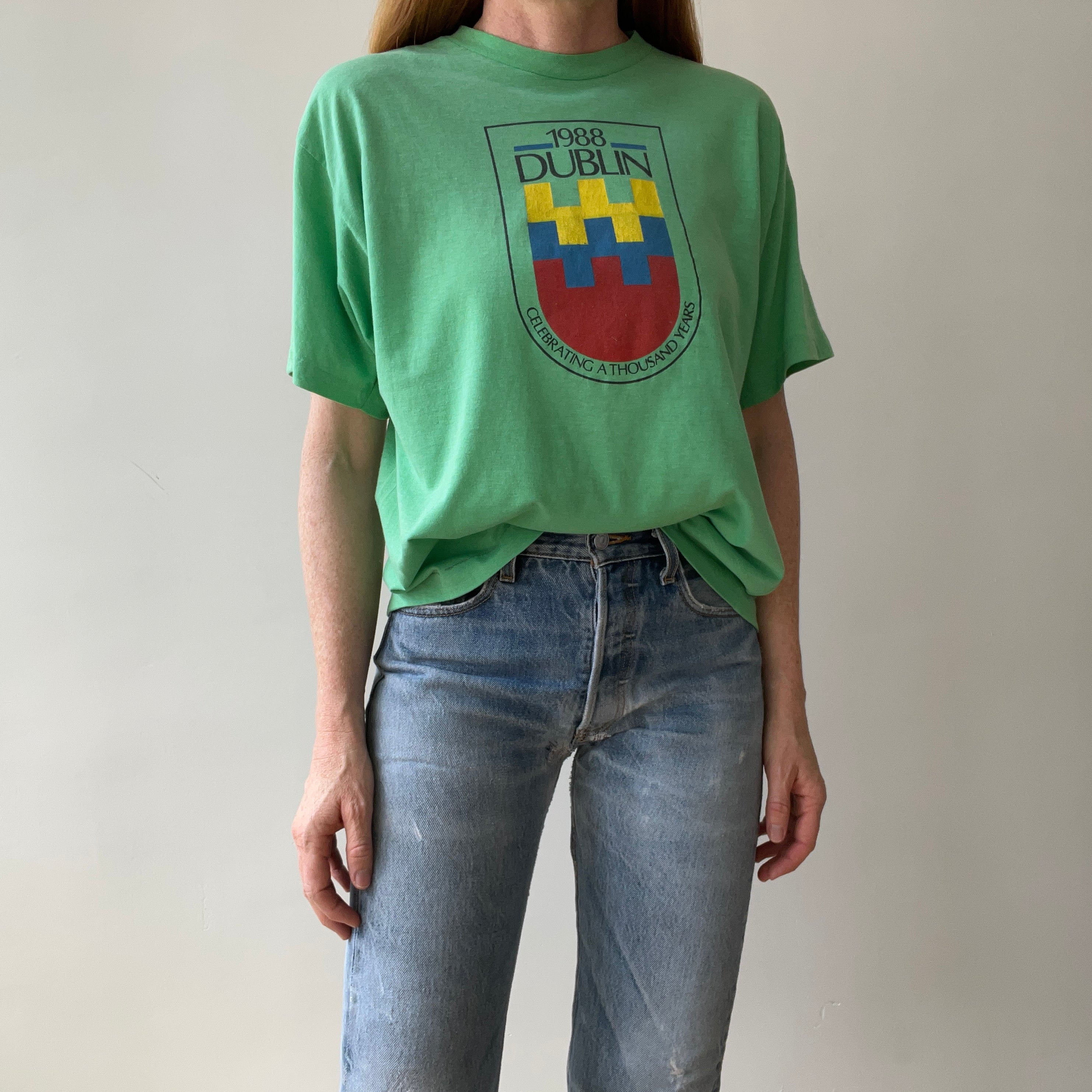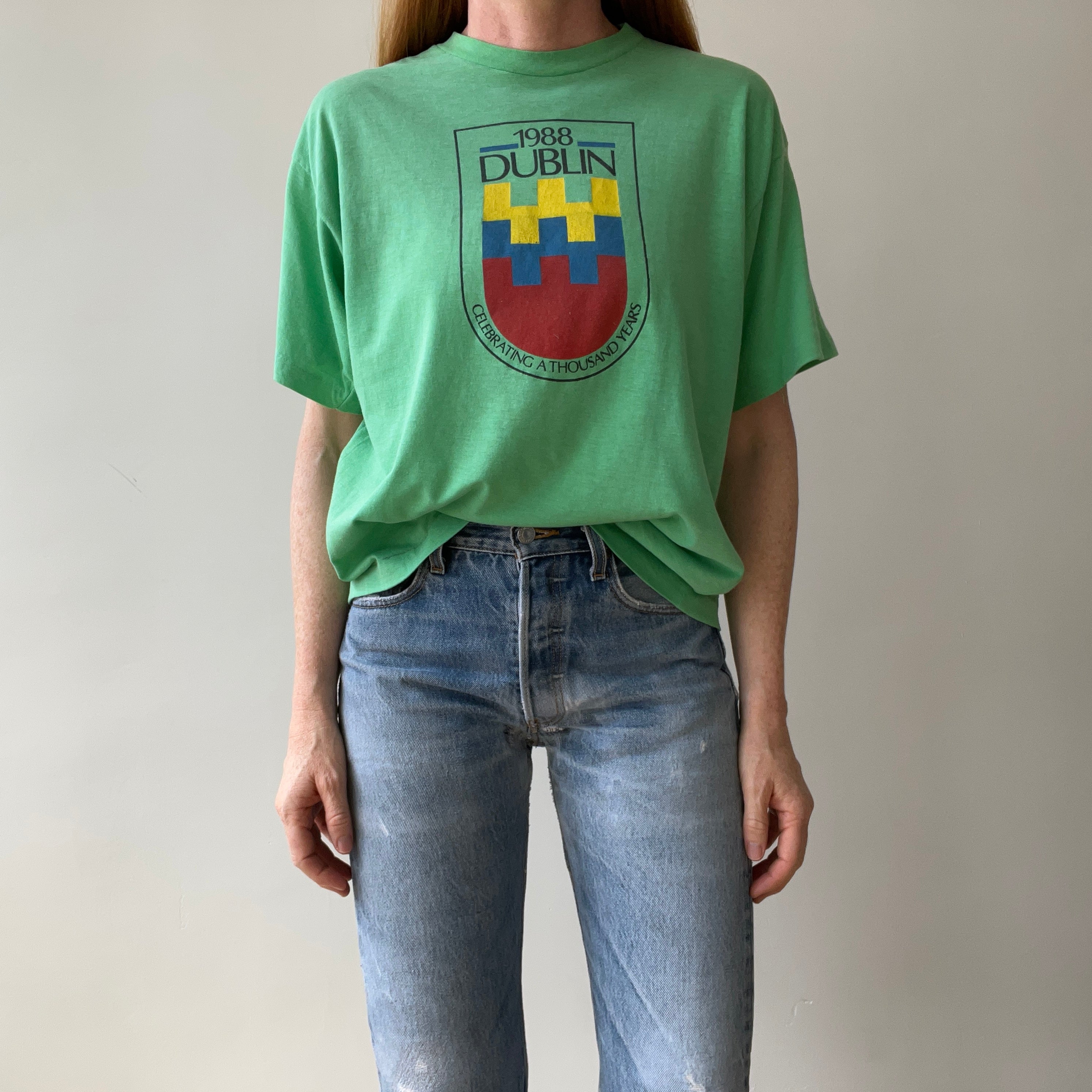 Notes: lightly worn, thin cotton, boxy cropped fit, single stitch - easy breezy and irish!