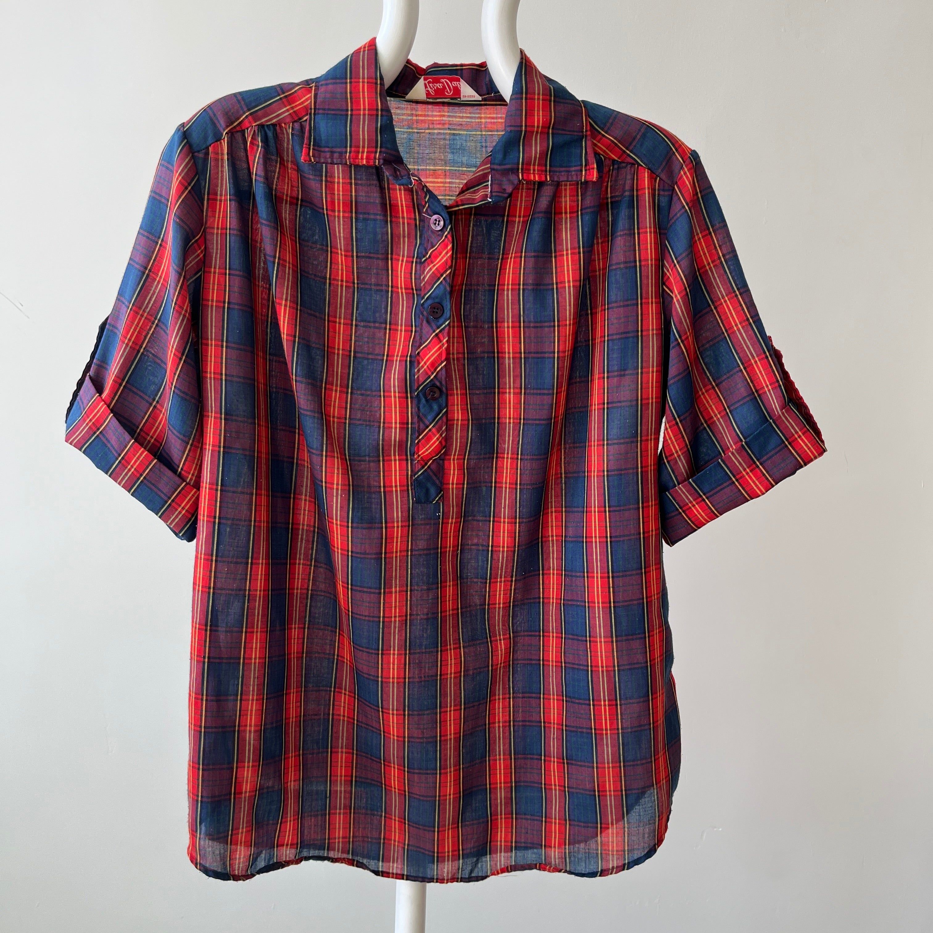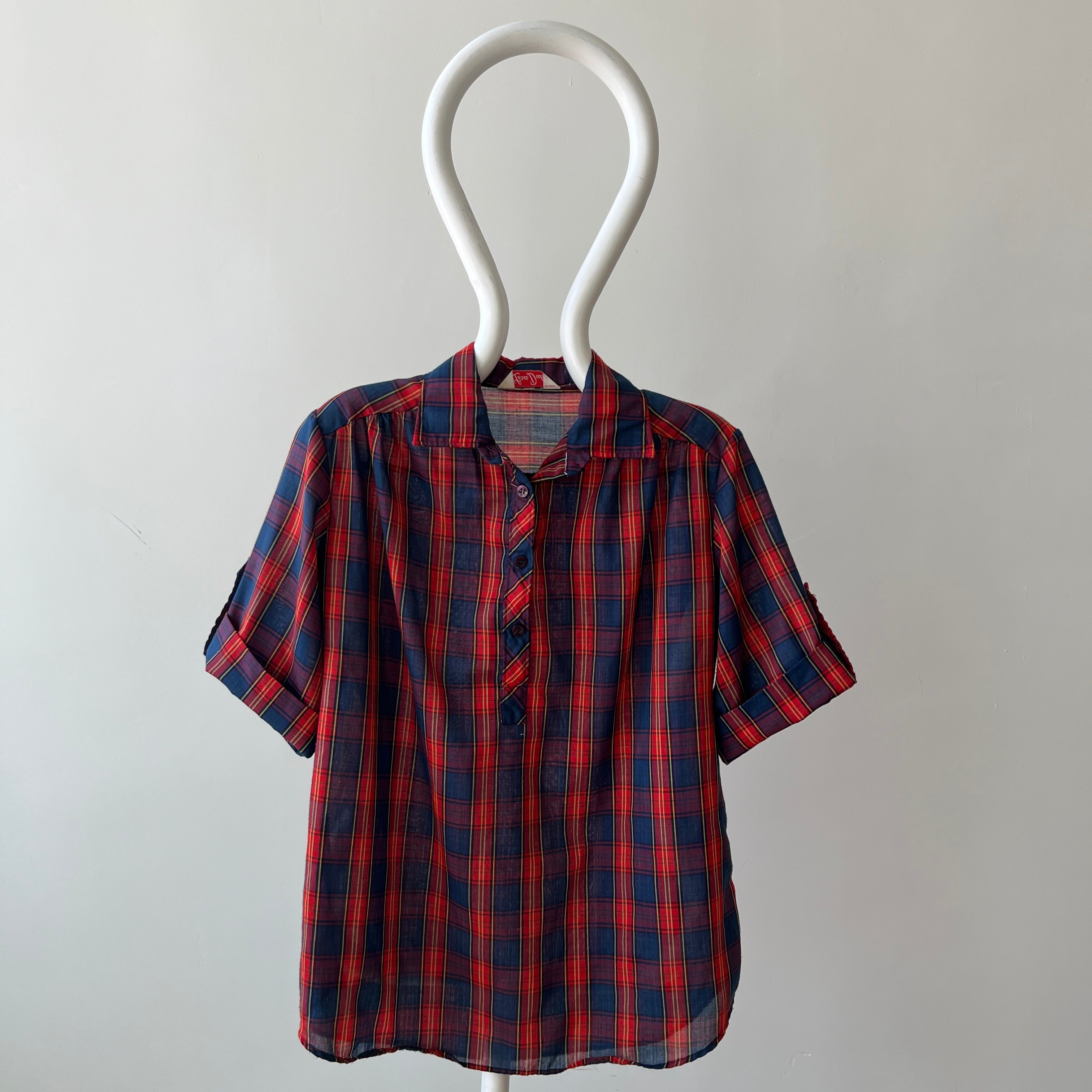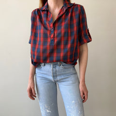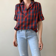 Notes: easy breezy blouse. sleeves rolled, lightweight, some pilling throughout, threads coming loose on right side seam, nice plaid