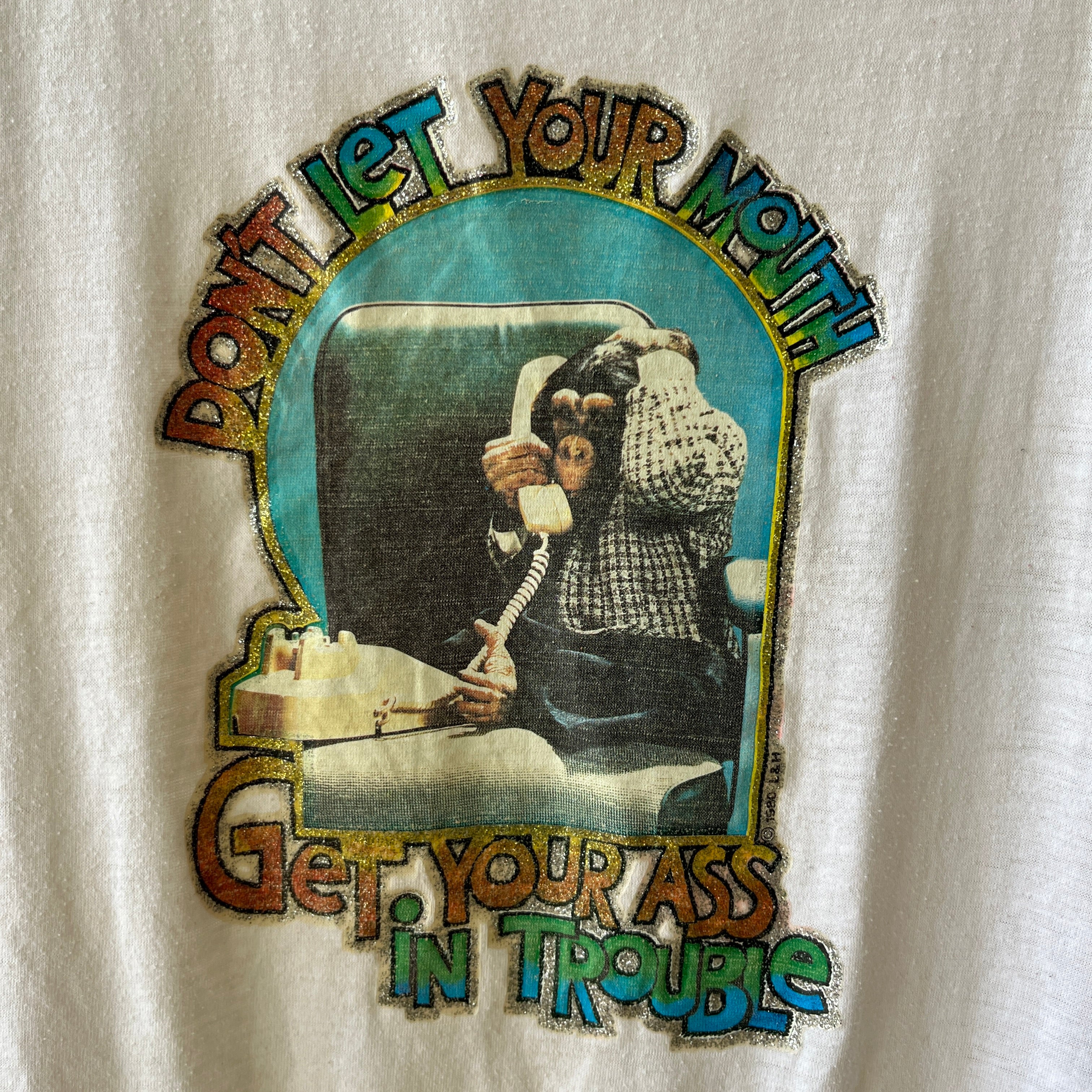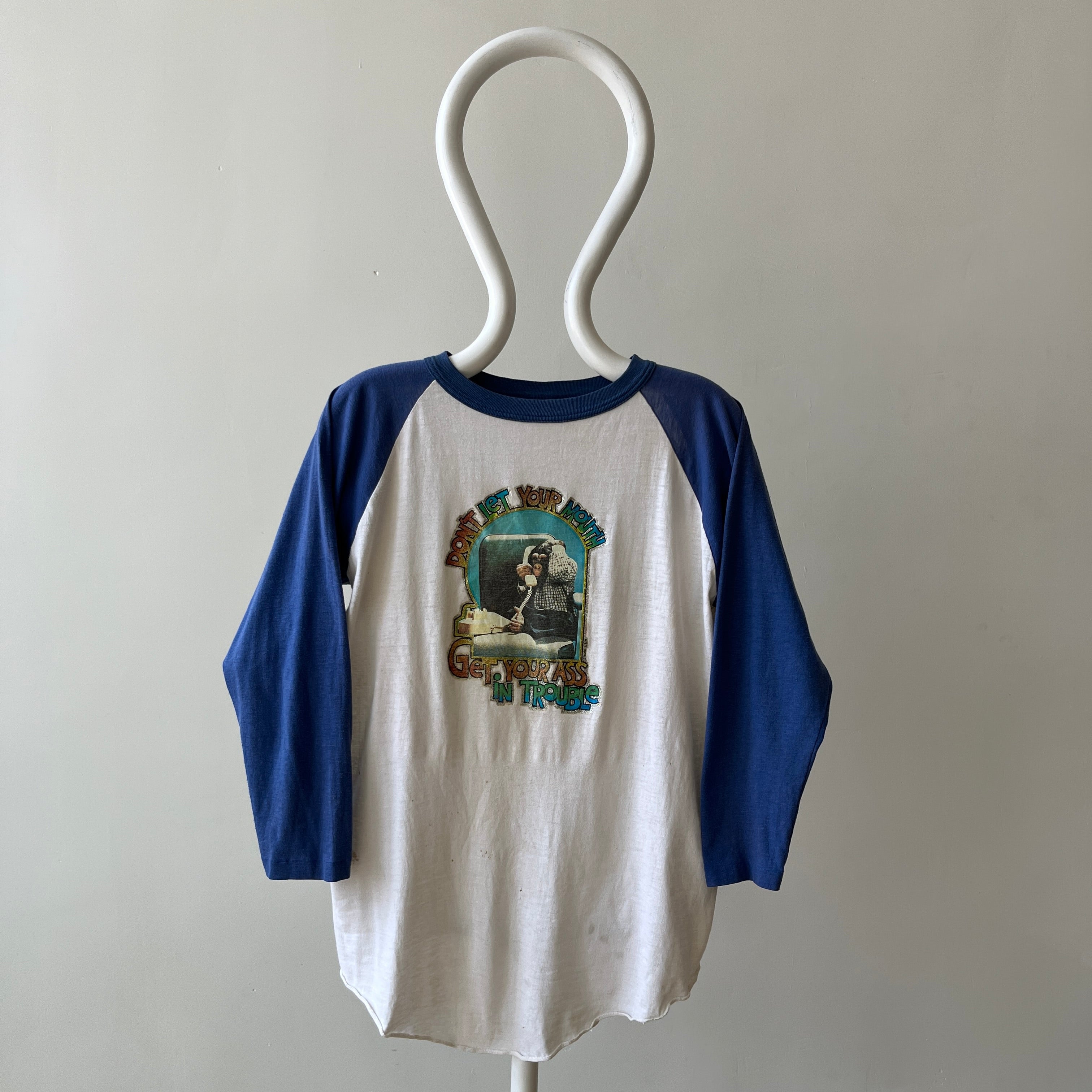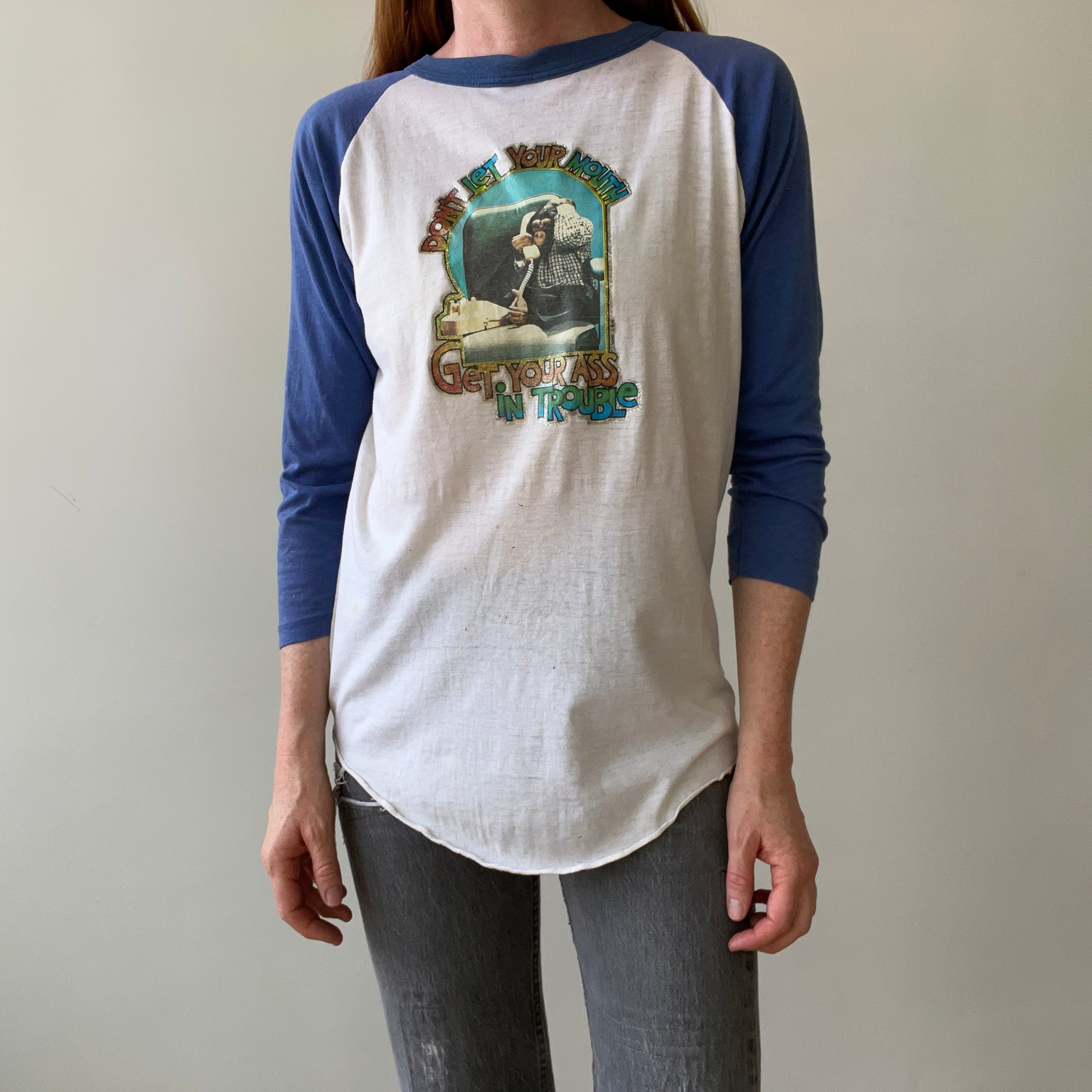 1980 J. Fred Muggs (iykyk) "Dont Let Your Mouth Get Your Ass In Trouble" Baseball Shirt