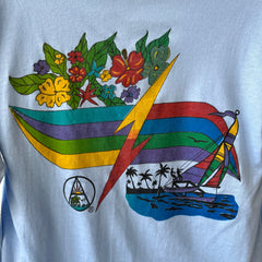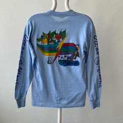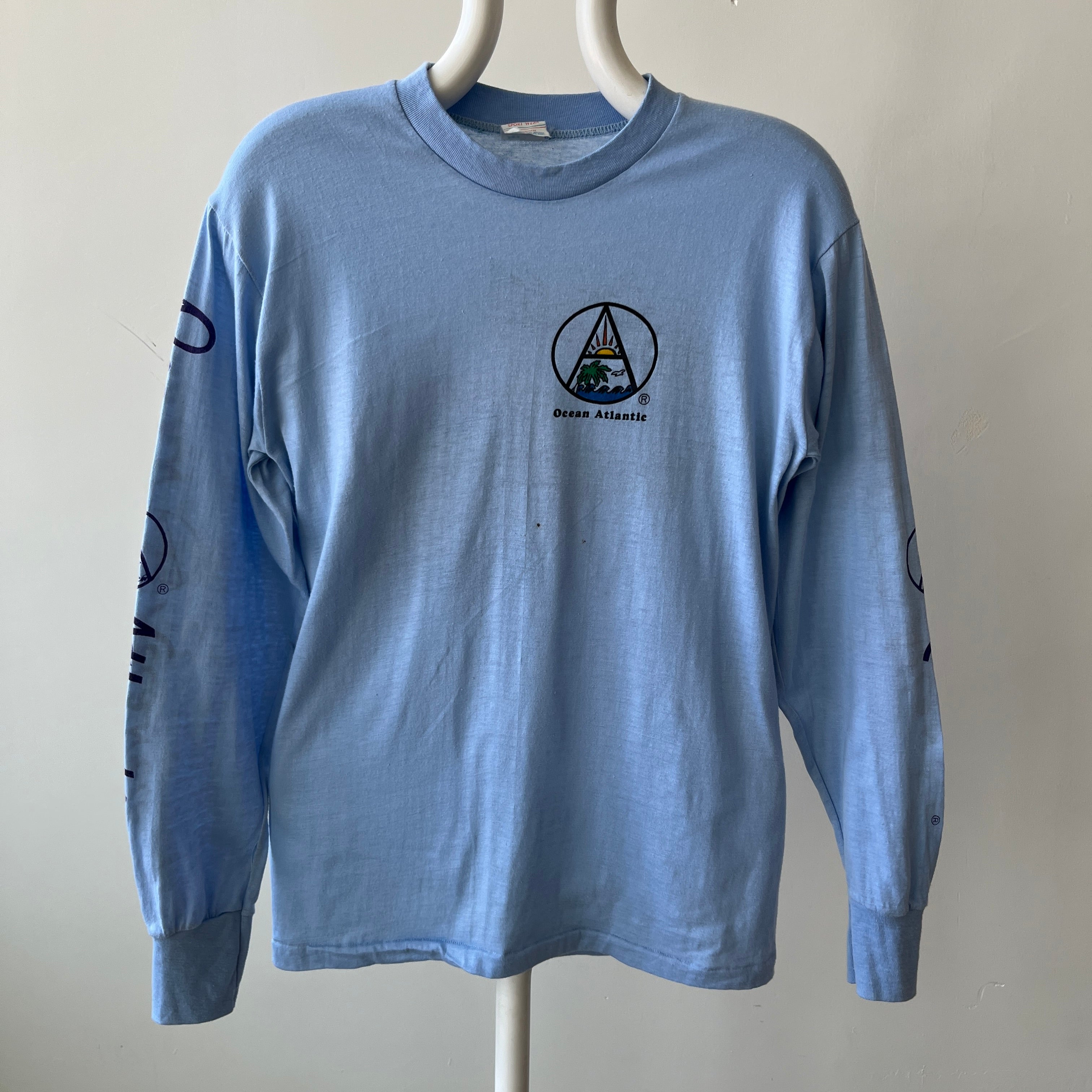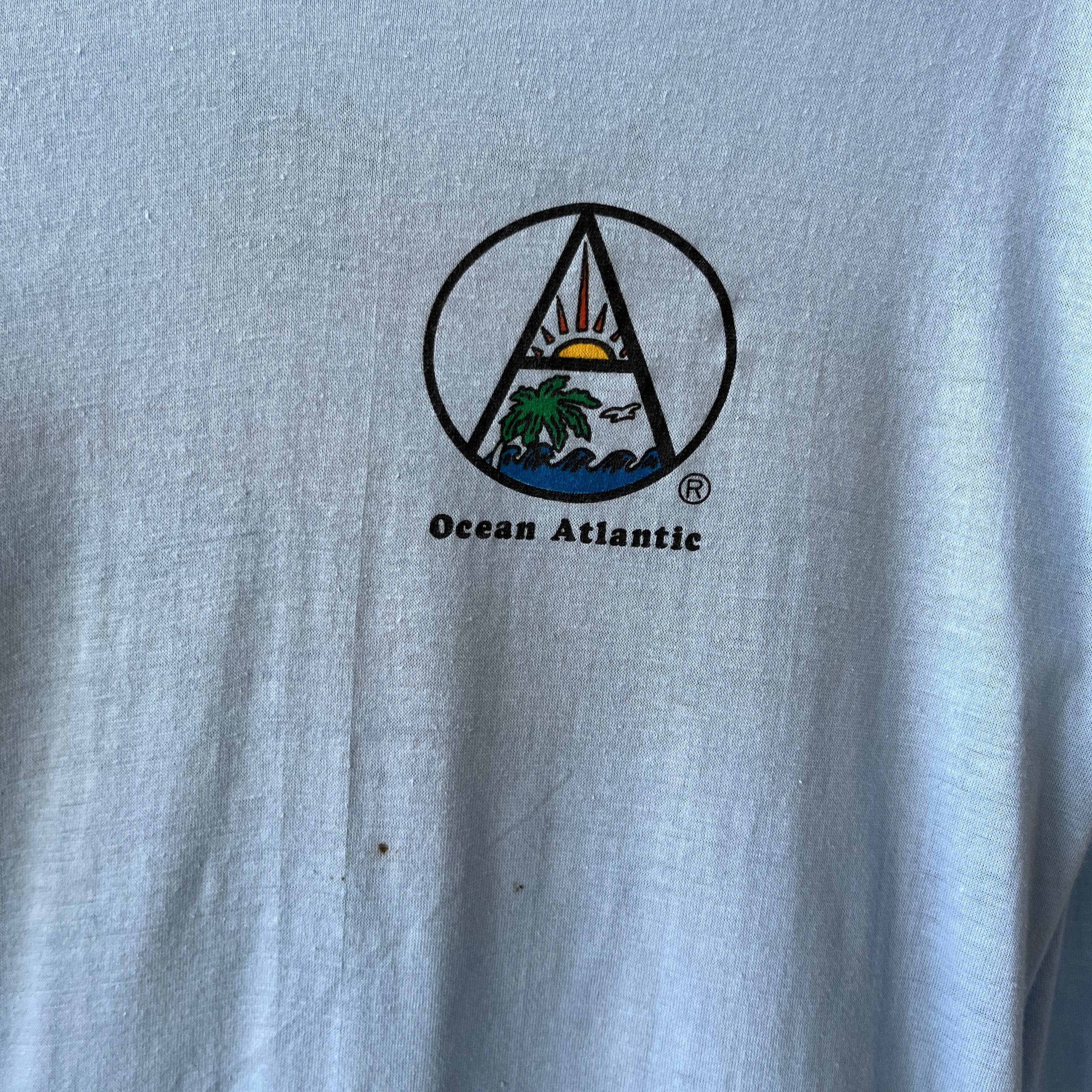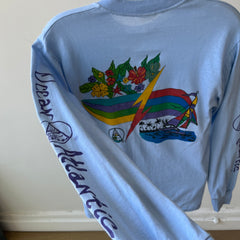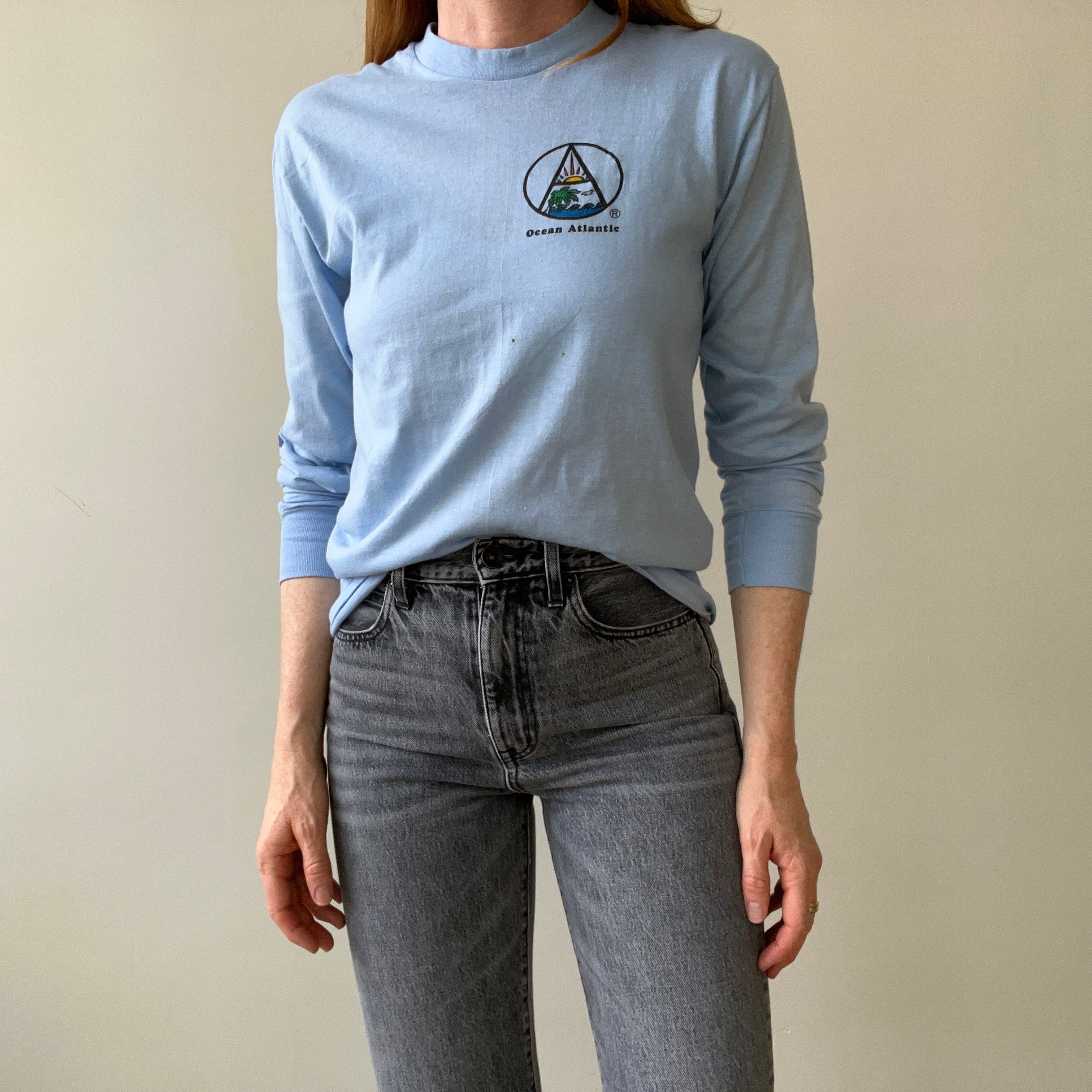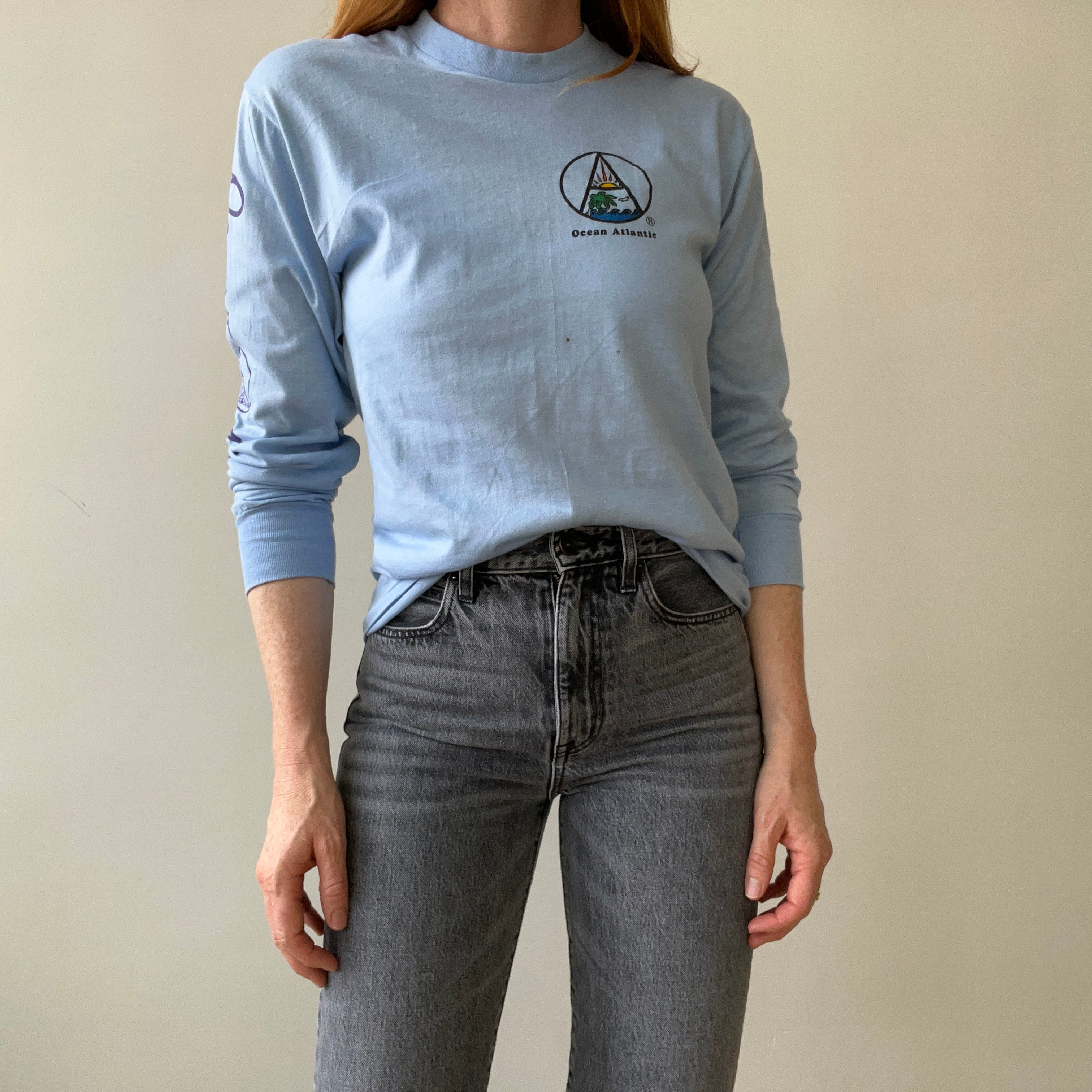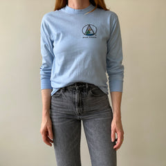 Notes: small stains, nice baby blue color, single stitch, awesome graphic, made in usa.