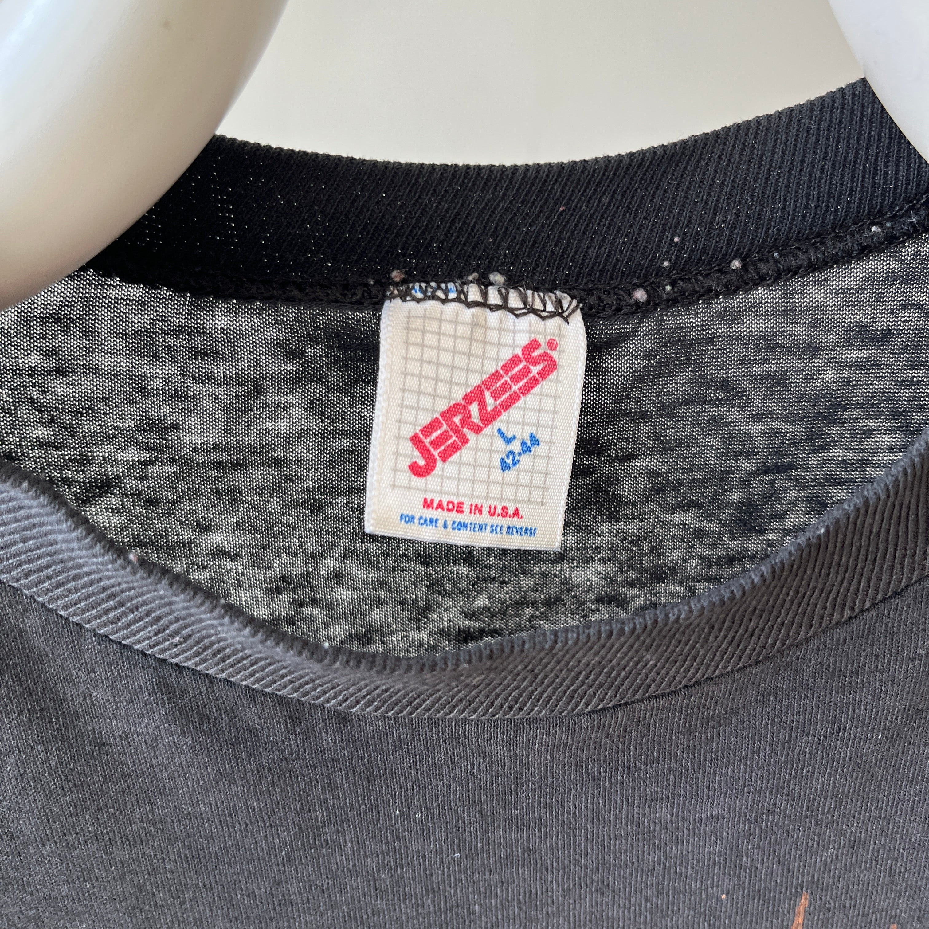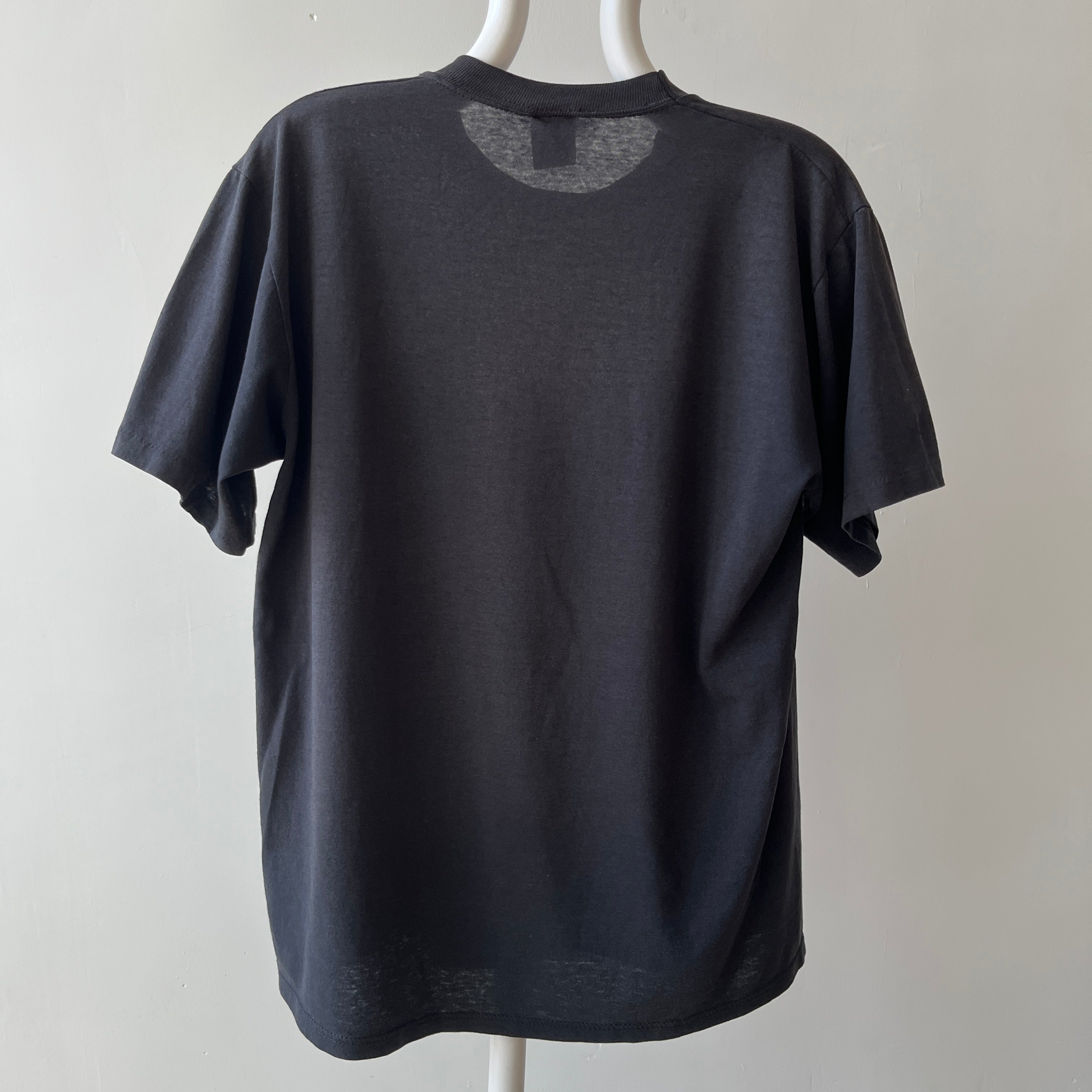 A lot of t-shirts back in the day were made from 50% cotton and 50% polyester. After decades of wear and tear they start to soften and get that “vintage t-shirt look”. 100% cotton shirts are generally a thicker feel and can appear more structured.
