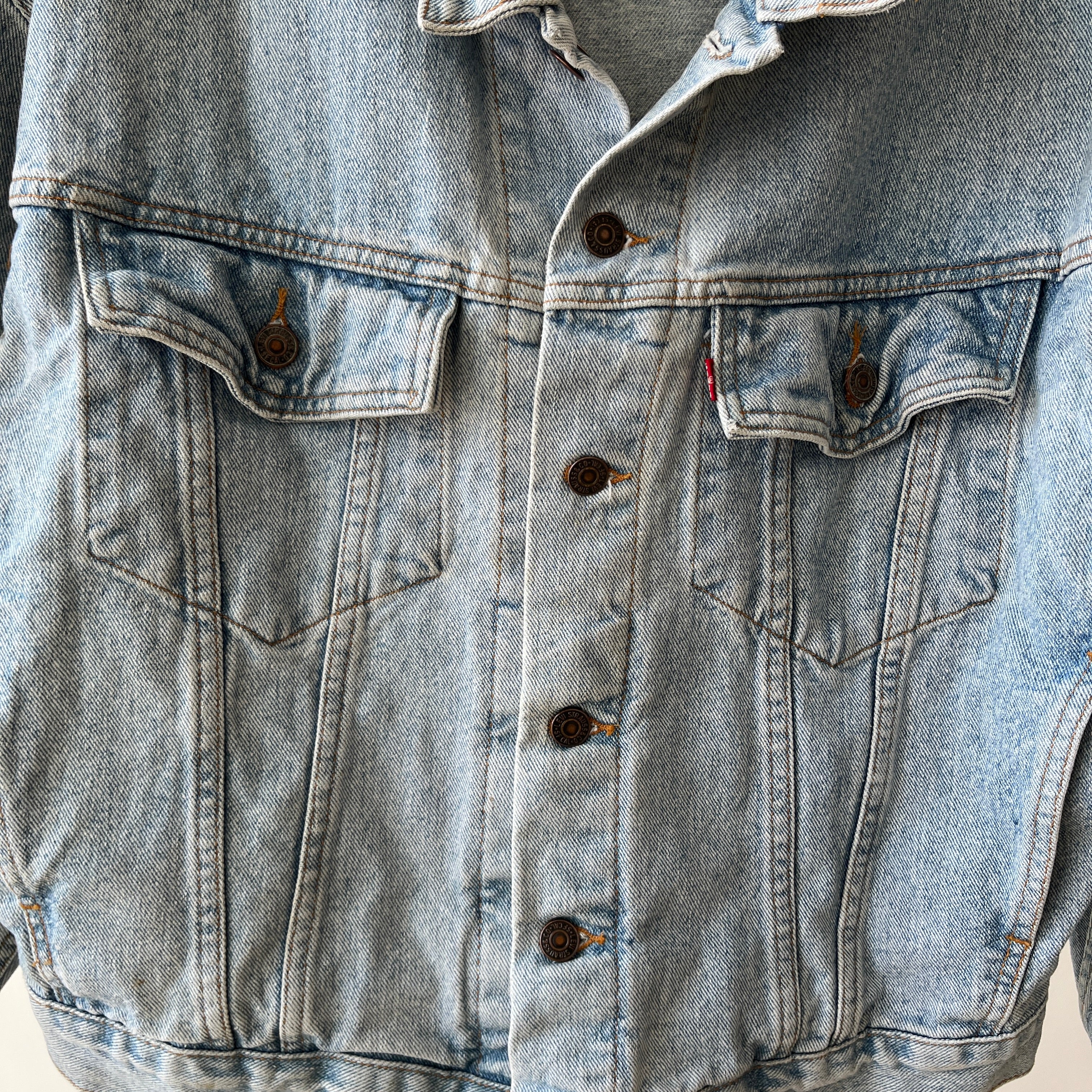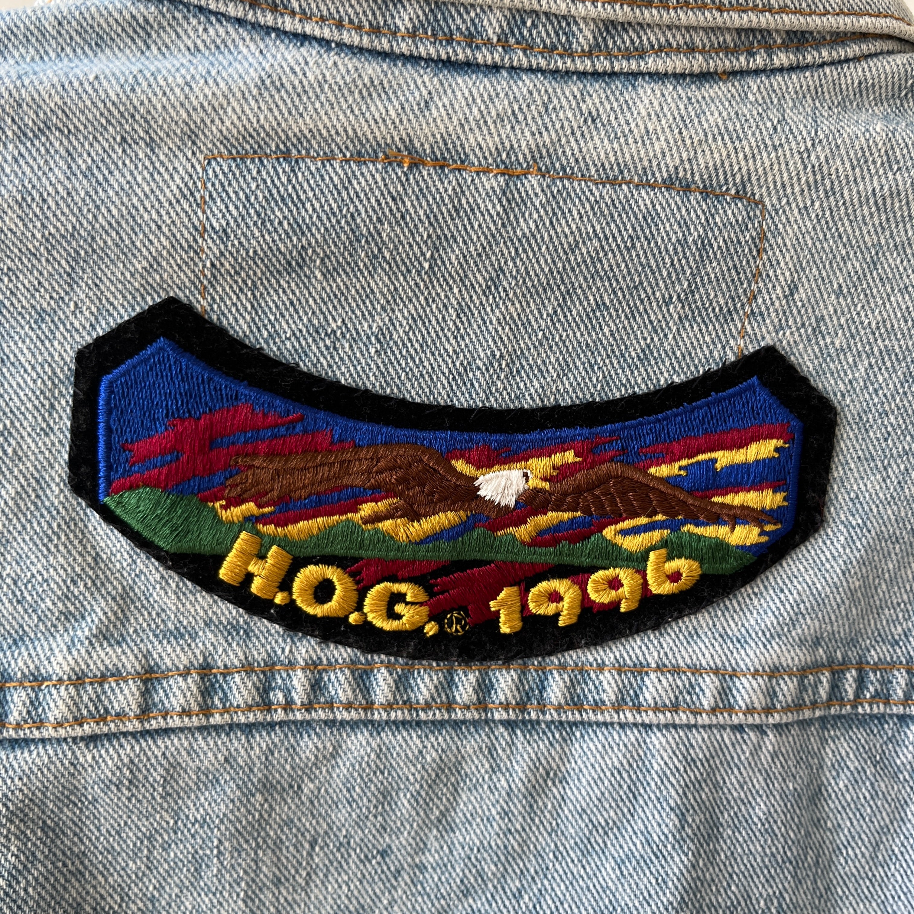 Notes: loose boxy fit, motorcycle patches, light wash - made in mexico. love the harley ladies patches. a one-of-a-kind!