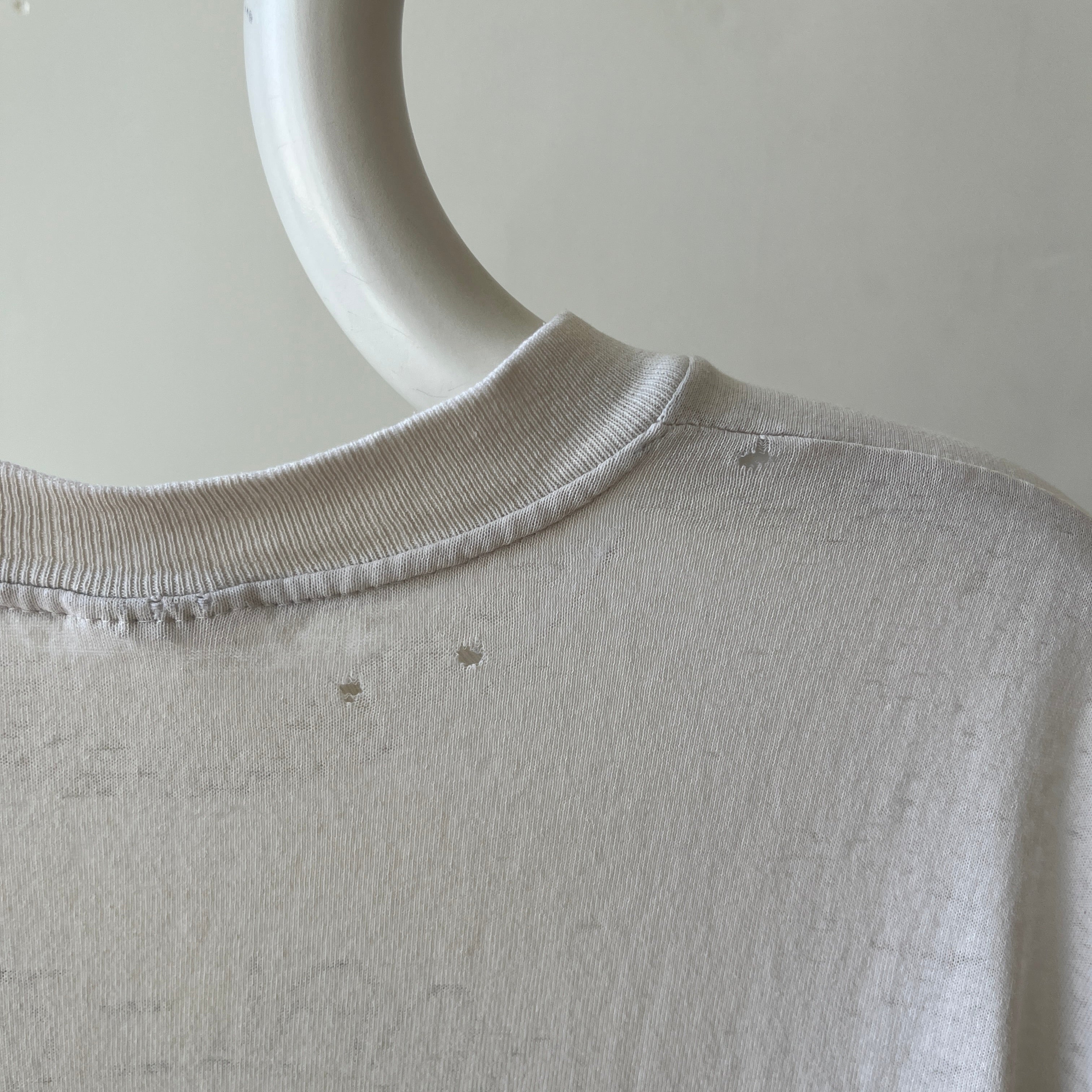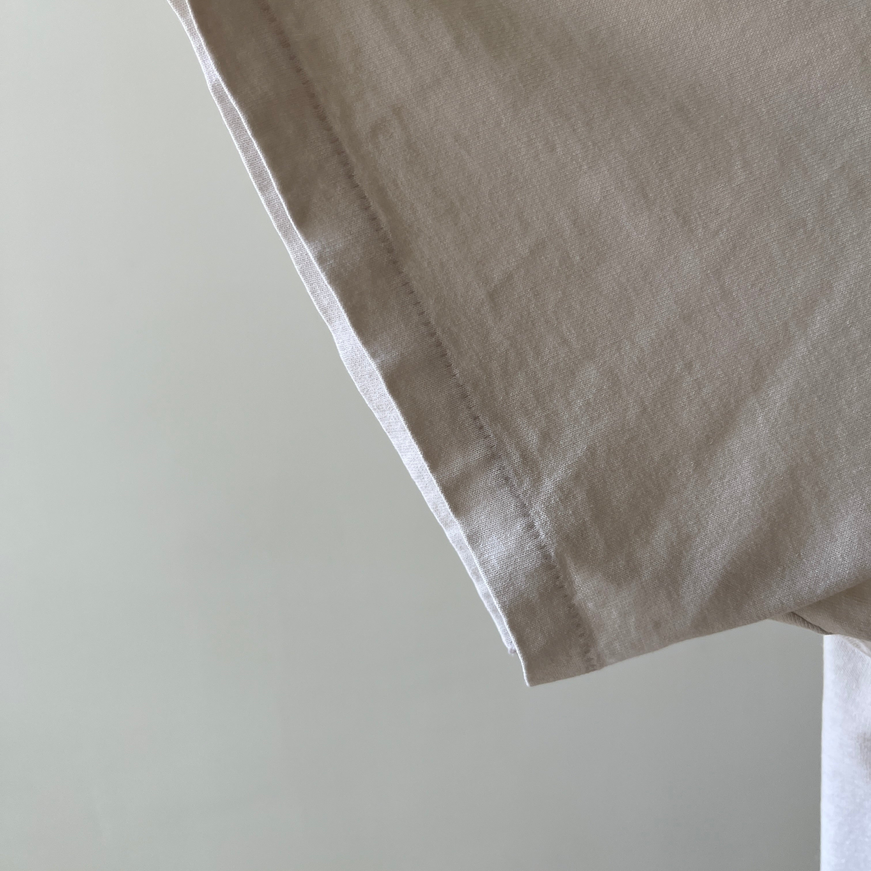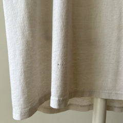 Stains are cool. But if I don’t have you convinced, that yellow jalopy hanging out on your new-old (now off) white tee could have been a mustard mishap from catching a fly ball at the World Series in ’83 with a hotdog in hand. Or from changing a flat tire on a college road trip to meet your future ex in-laws? Stains have stories even when they’re in the pits! Sweating in your favorite Hanes crewneck on your first middle school date can have a life long impact on a t-shirt.