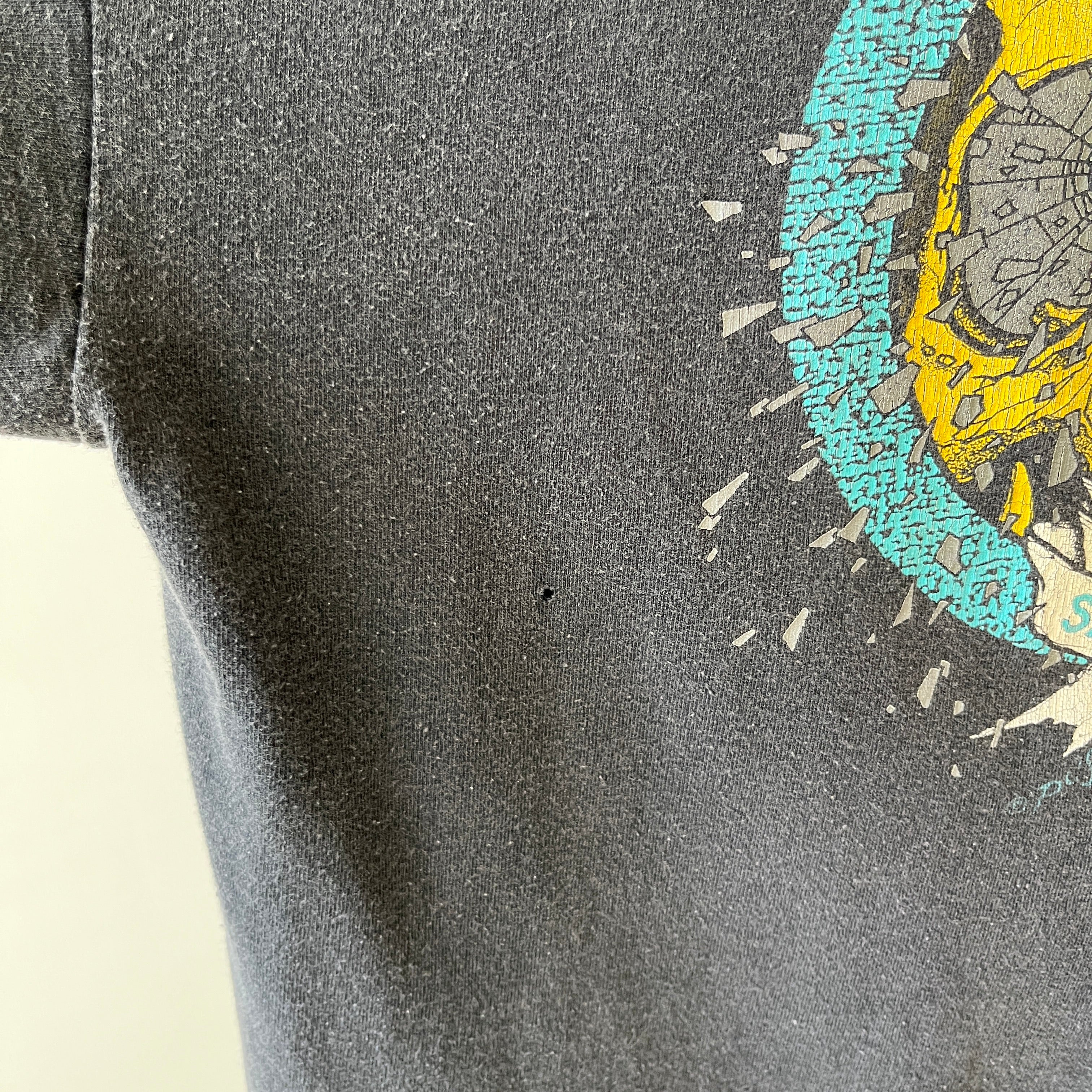 Notes: faded and worn, small holes, single stitch sleeves, made in usa, grail!