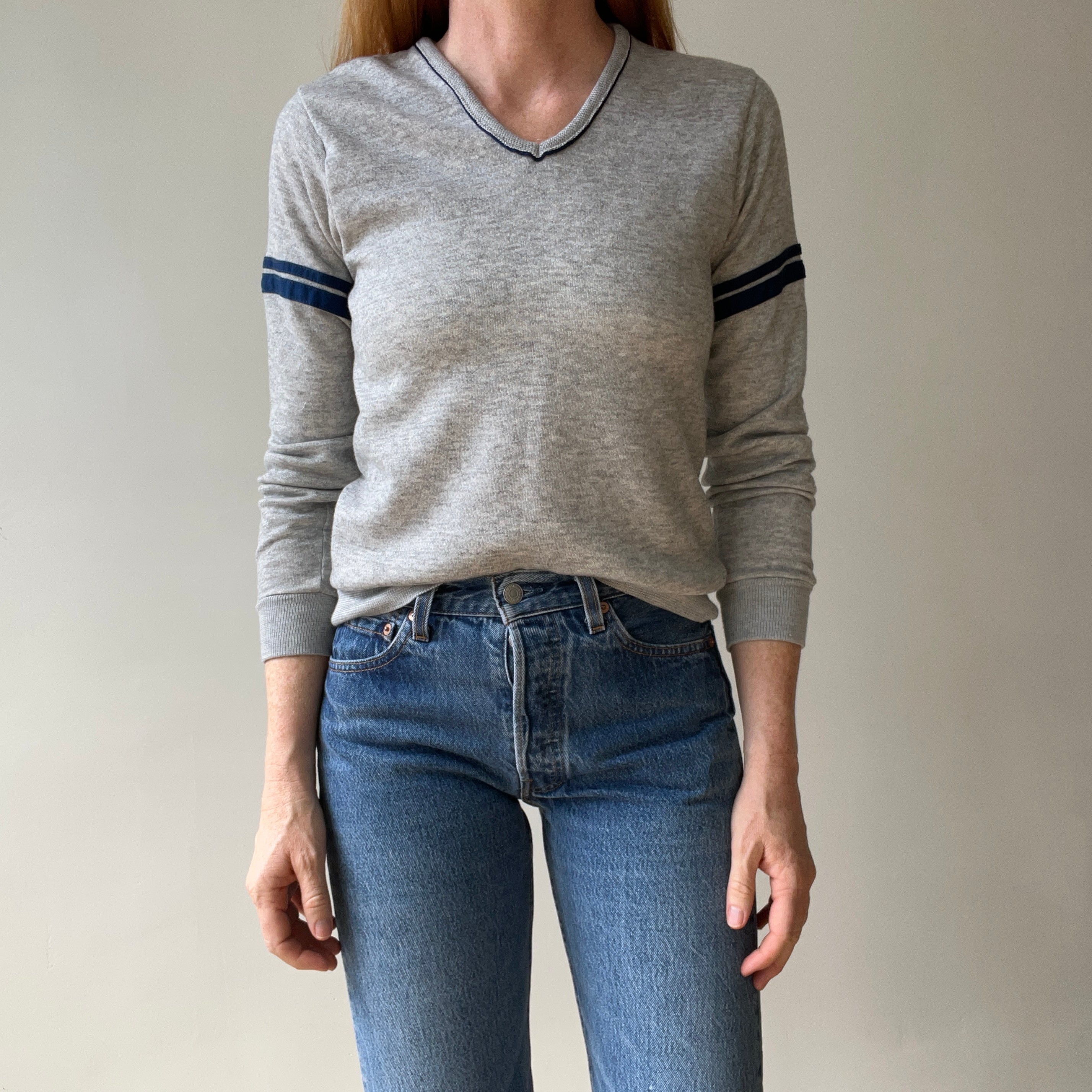 Notes: light wear, soft cotton, slim fit, navy blue arm rings, made in usa - a smaller delight.