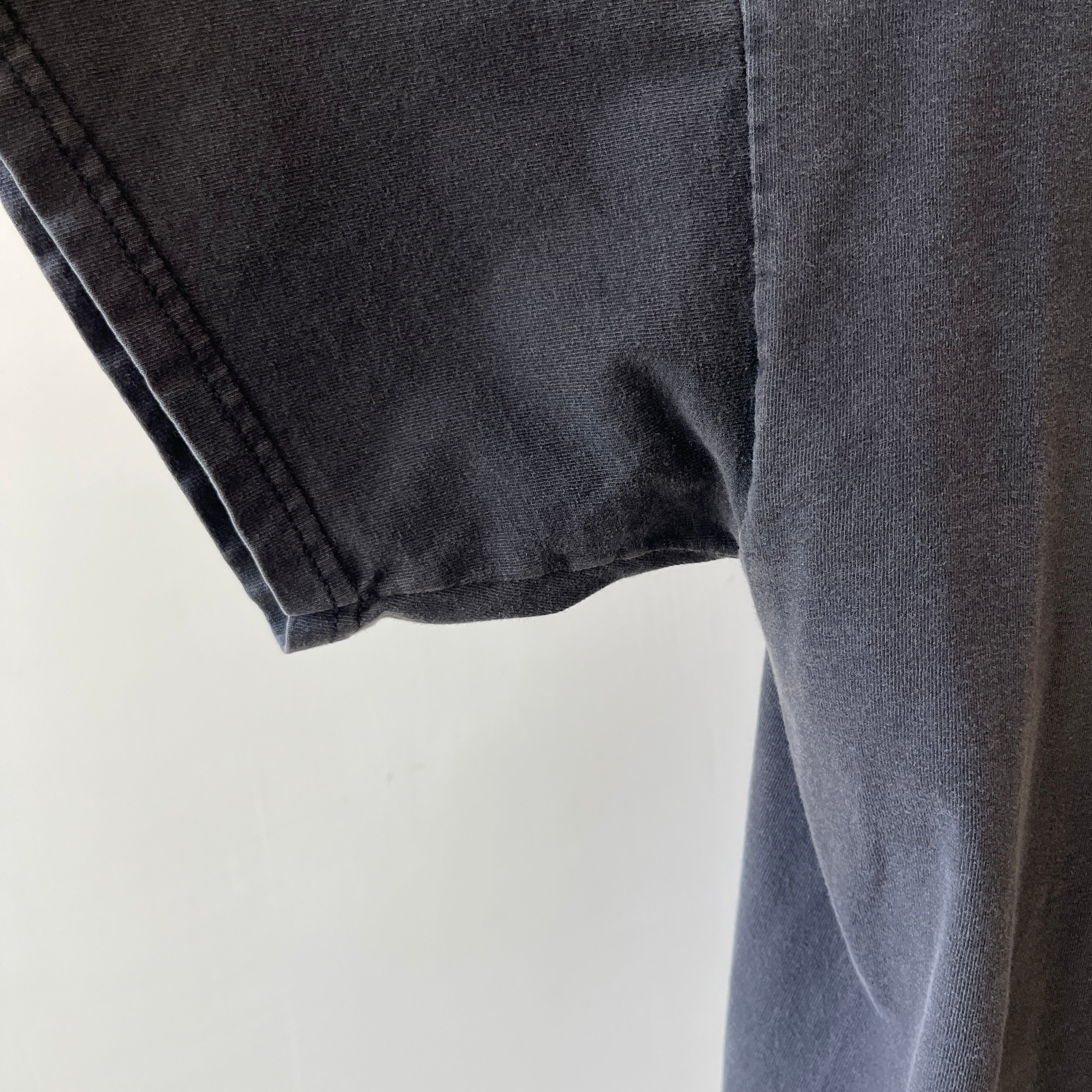 A lot of t-shirts back in the day were made from 50% cotton and 50% polyester. After decades of wear and tear they start to soften and get that “vintage t-shirt look”. 100% cotton shirts are generally a thicker feel and can appear more structured.