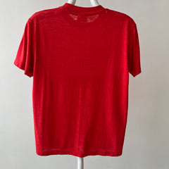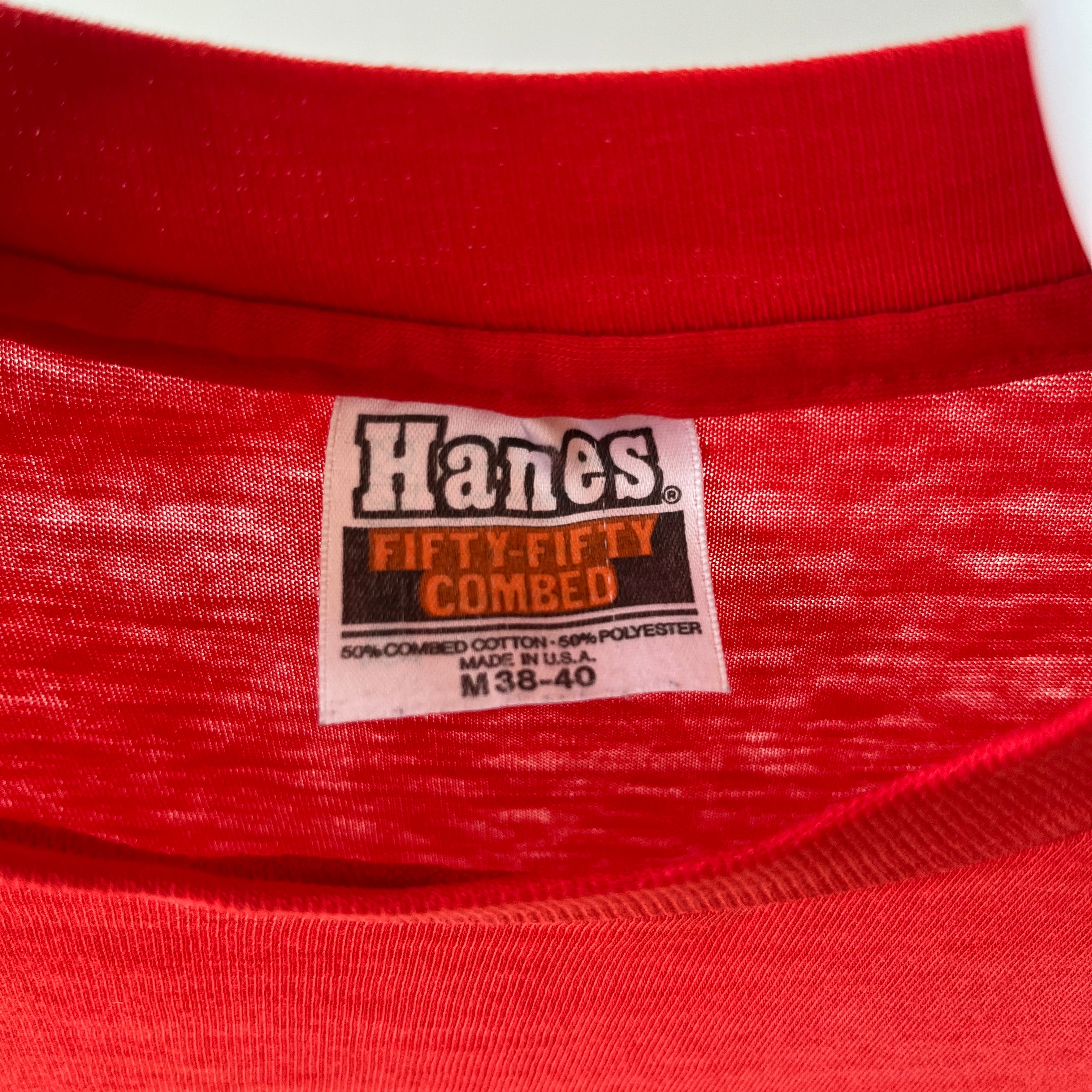 Beaucoup de t-shirts à l'époque étaient fabriqués à partir de 50% coton et 50% polyester. Après des décennies d'usure, ils commencent à s'adoucir et à obtenir ce "look de t-shirt vintage". Les chemises 100 % coton sont généralement plus épaisses et peuvent paraître plus structurées.