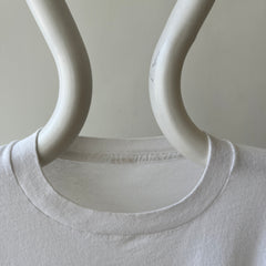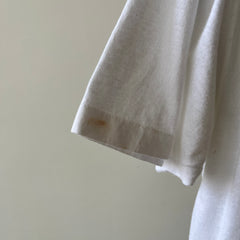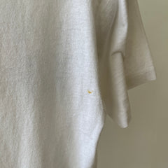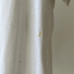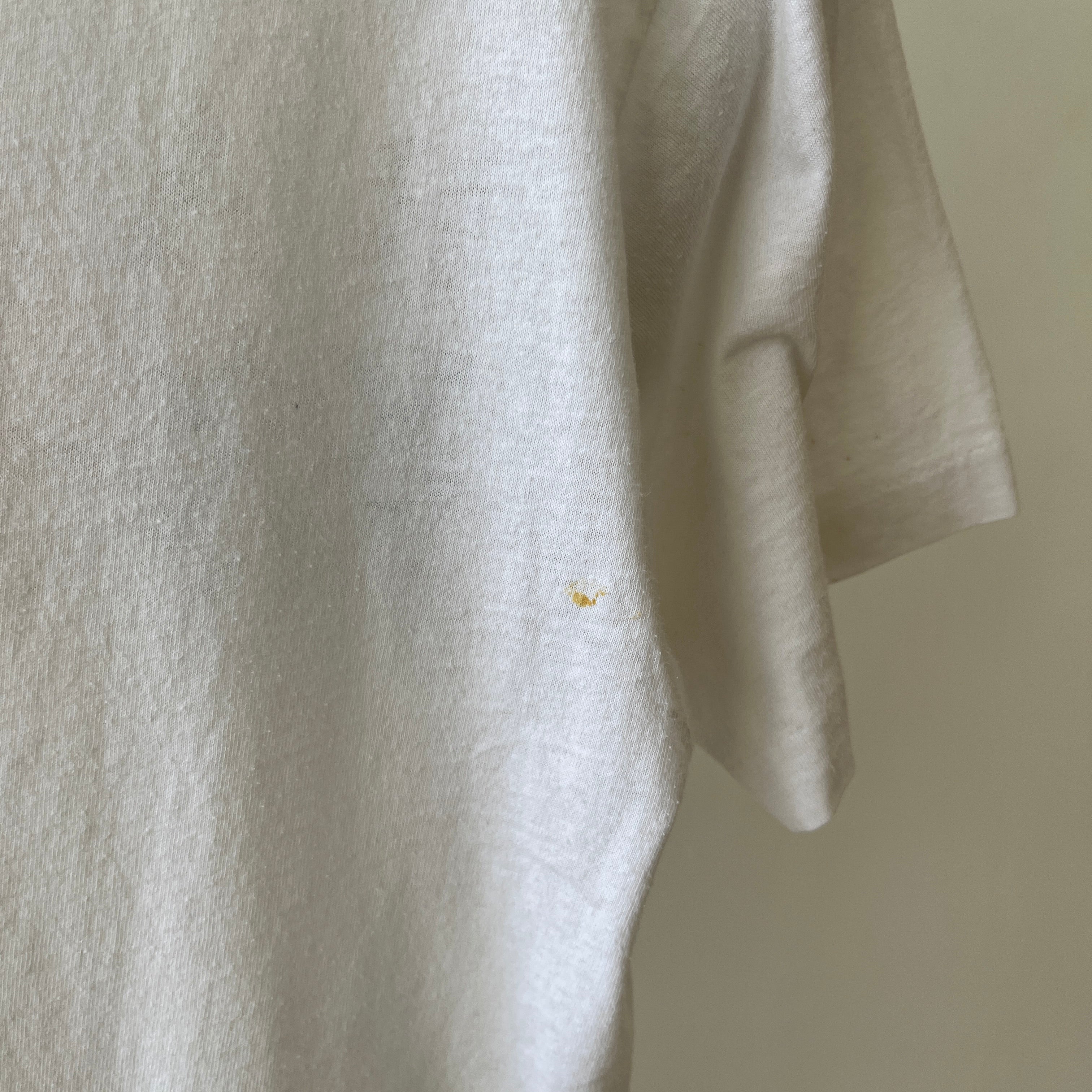 Stains are cool. But if I don’t have you convinced, that yellow jalopy hanging out on your new-old (now off) white tee could have been a mustard mishap from catching a fly ball at the World Series in ’83 with a hotdog in hand. Or from changing a flat tire on a college road trip to meet your future ex in-laws? Stains have stories even when they’re in the pits! Sweating in your favorite Hanes crewneck on your first middle school date can have a life long impact on a t-shirt.